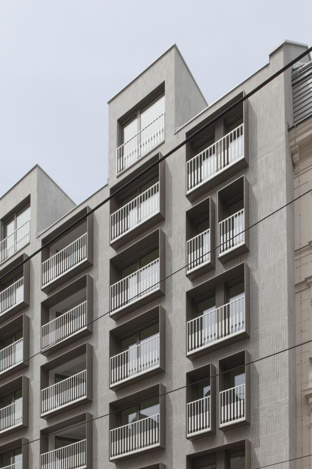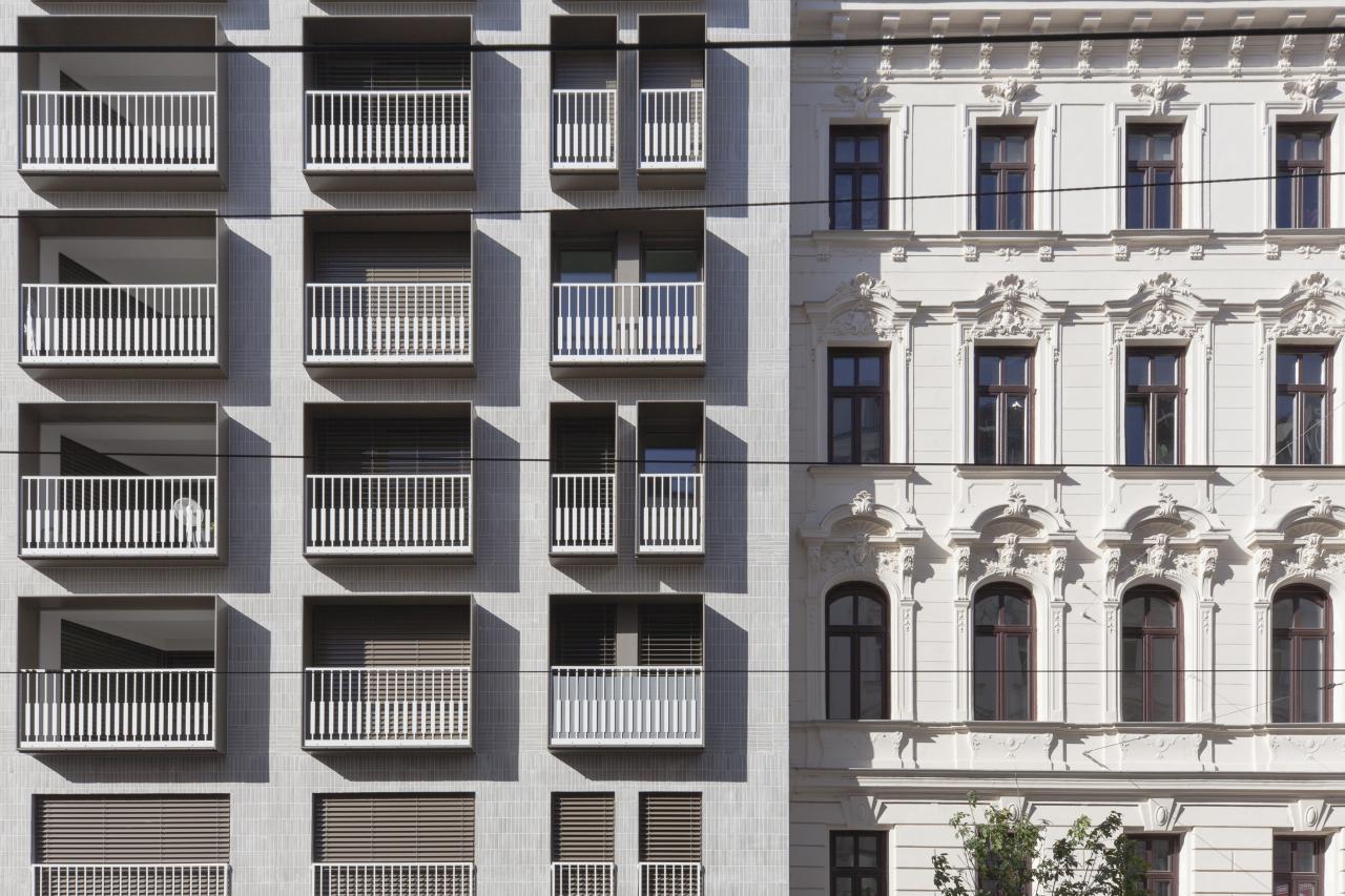 The revitalization project in Porzellangasse is an example of best practice in dealing with a building from the 1990s. The original building from 1998 was used as an office building. Now it houses a commercial space on the first floor and 24 apartments that meet the contemporary standard of a city apartment. The existing building was neither visually nor technically outstanding and only partially complied with official requirements. Demolition was never an option and would have been extremely difficult due to its location on Porzellangasse, which is served by a tram. A contemporary approach to the existing building for ecological reasons and a sustainable approach spoke in favor of preserving and converting the building. Most of the 24 apartments open on both sides of the building, allowing ventilation and providing additional outdoor space in the form of balconies and small terraces. Creating additional outdoor space was an important concern for the architects. The view to the outside and the ability to open the apartment not only increase the standard of living, but also visually enlarge the apartment. When designing the street-side facade, special consideration was given to the appearance of the building, and the color and materiality of the neighboring buildings were considered. Light grey clinker brick slips, alternating horizontally and vertically with the floor boundaries, give the front of the building a classic structure. The color of the dark window frames also reflects the street scene.