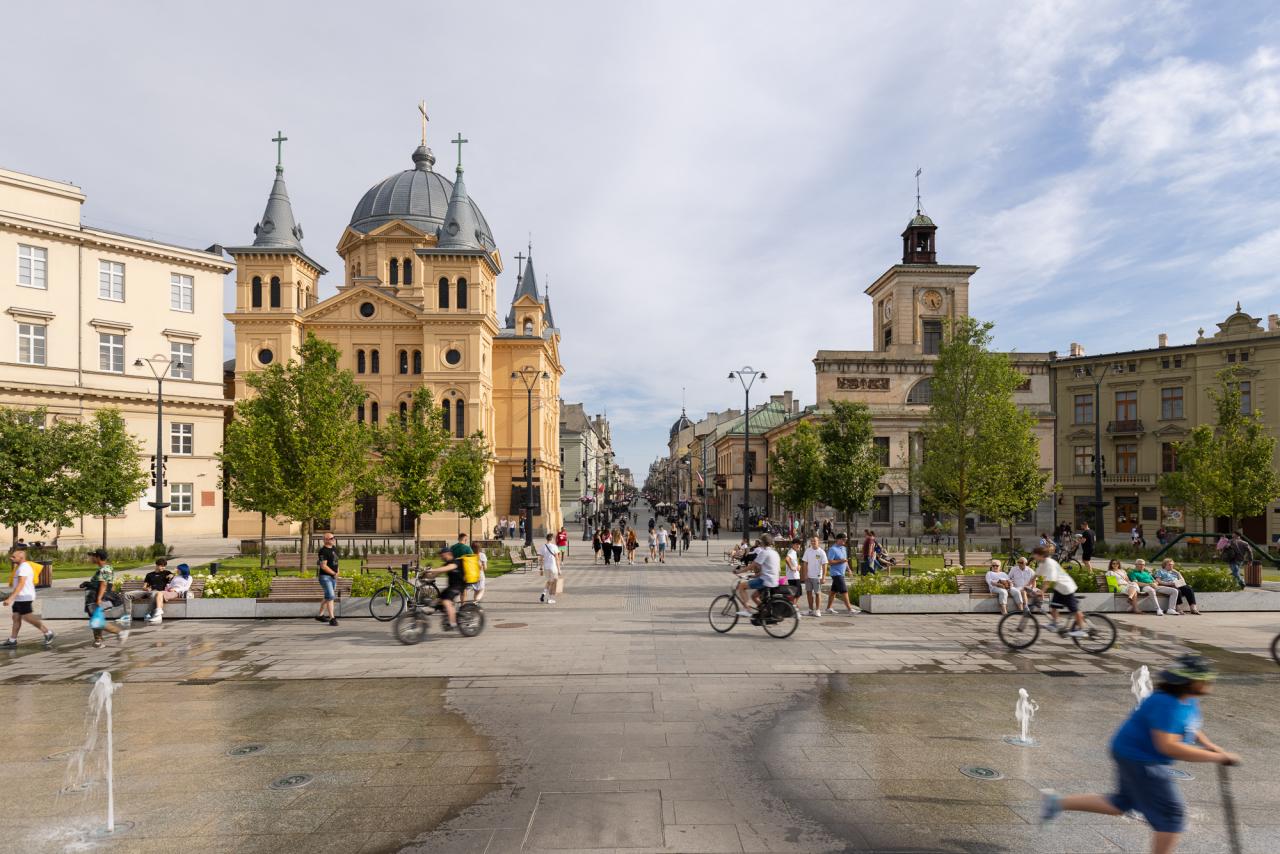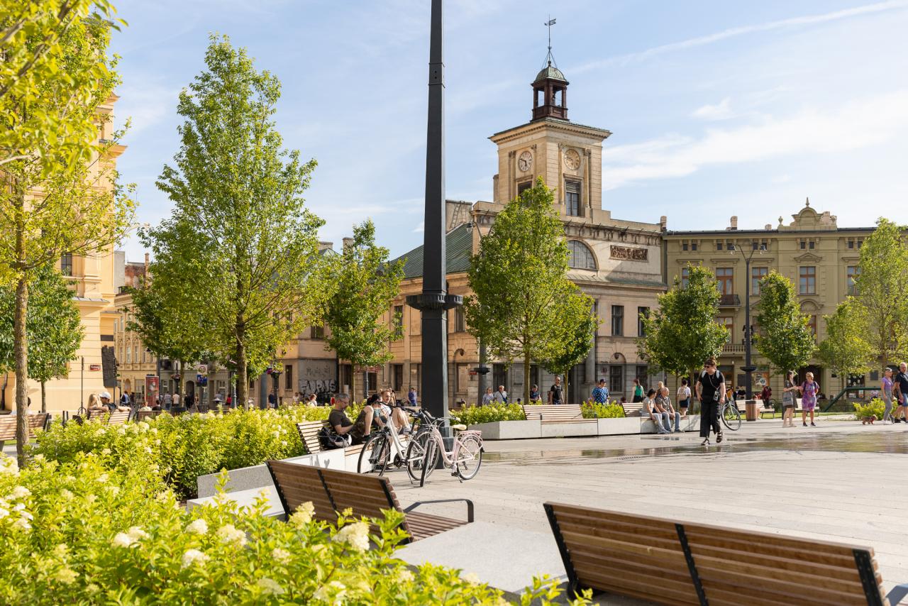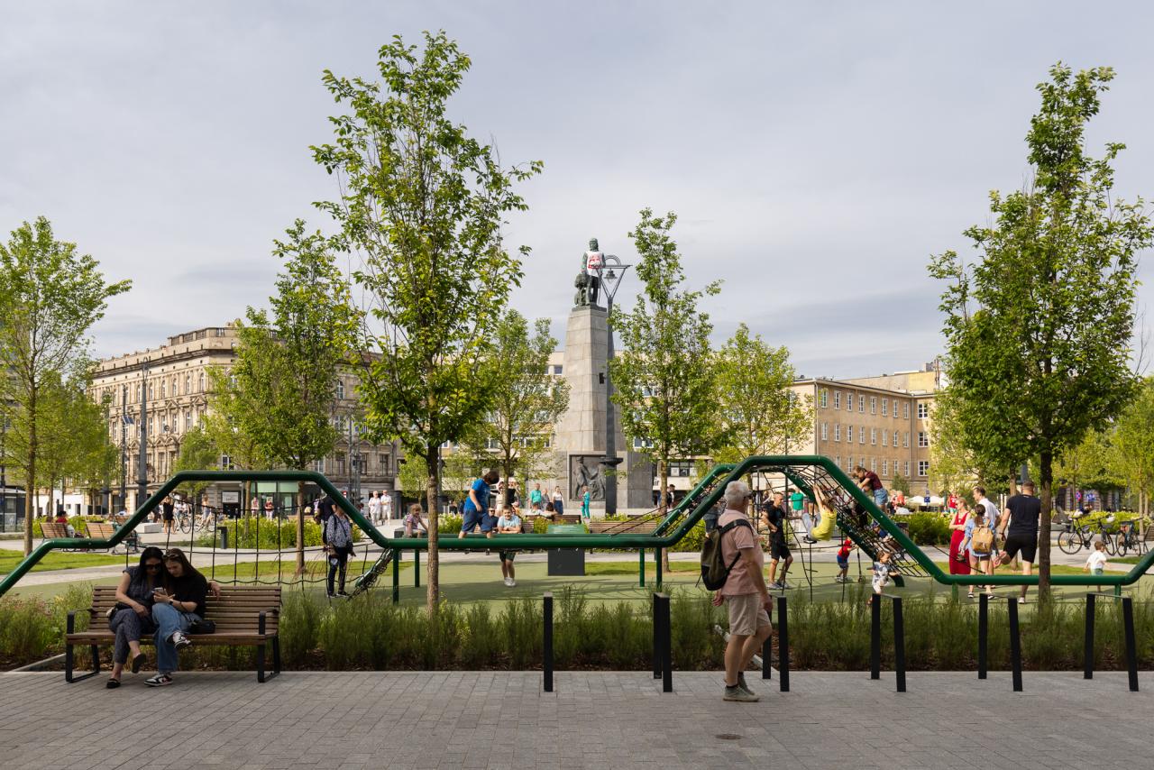 The redevelopment of Freedom Square in Łódź aimed to restore the historical significance and social functionality of one of the city's most iconic public spaces. Once dominated by tram tracks and vehicular traffic, the square was transformed into a vibrant, pedestrian-friendly area that enhances urban life. The comprehensive redevelopment, completed in the spring of 2024 under the Łódź Area Revitalization Program, introduced 64 trees, rain gardens, and permeable surfaces reducing the urban heat island effect. The square now includes dedicated areas for recreation, relaxation, and cultural events, making it accessible and welcoming to all demographic groups, including children, seniors, and individuals with mobility challenges. The target groups of the project include Łódź residents, visitors, and local businesses, who benefit from a revitalized urban center that fosters social interactions and improves quality of life. Specific objectives included increasing the biologically active area, promoting sustainability through innovative water management systems, and preserving the historical character of the space. The redevelopment of Freedom Square also shifted the focal point of Łódź’s city center, integrating areas that were previously fragmented into isolated pockets. By enhancing pedestrian connectivity between these spaces, the project has transformed the movement dynamics of residents, encouraging sustainable, active mobility. This seamless integration fosters a more cohesive urban experience, where walking and cycling become natural choices, reducing reliance on vehicular transport and promoting a healthier, more connected city life. The square now hosts cultural events, encourages everyday activities, and serves as a platform for community interactions. This project harmoniously combines historical preservation with modern urban sustainability principles, establishing Square as a model of sustainable urban regeneration.