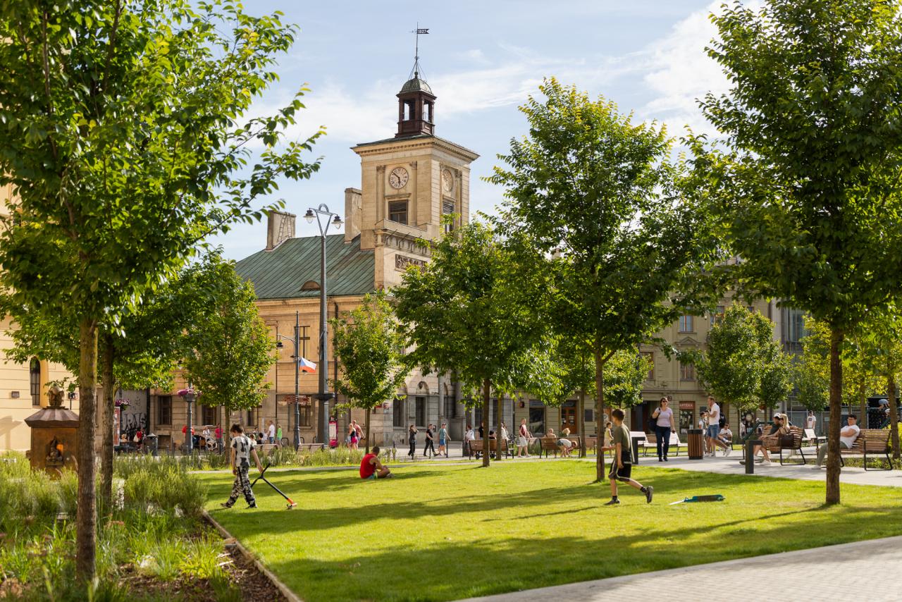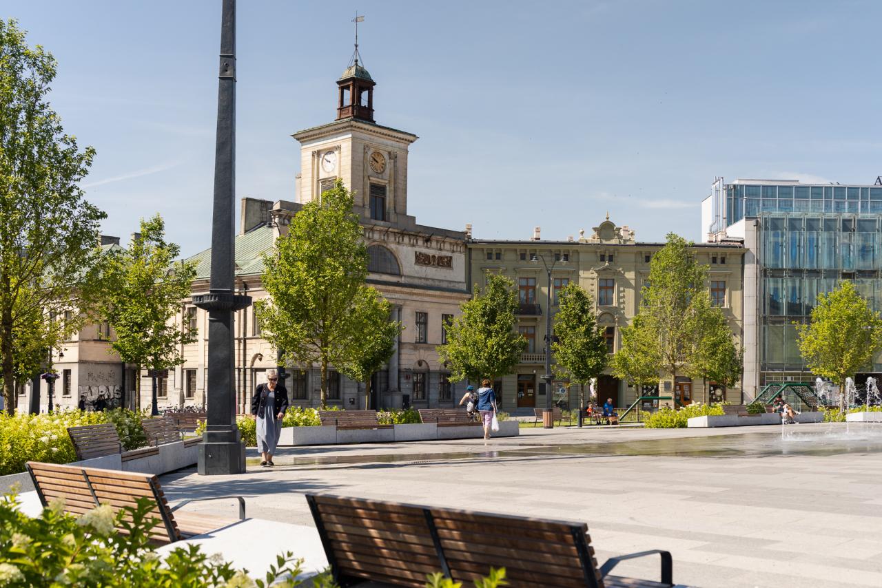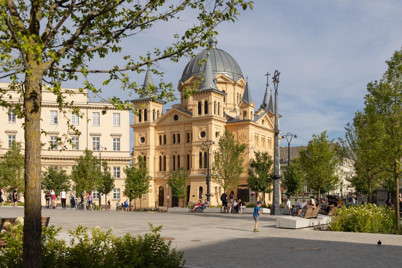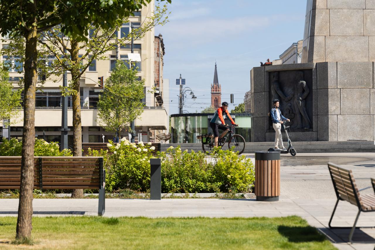 The redevelopment of Freedom Square in Łódź aimed to restore the historical significance and social functionality of one of the city's most iconic public spaces. Once dominated by tram tracks and vehicular traffic, the square was transformed into a vibrant, pedestrian-friendly area that enhances urban life. The comprehensive redevelopment, completed in the spring of 2024 under the Łódź Area Revitalization Program, introduced 64 trees, rain gardens, and permeable surfaces reducing the urban heat island effect. The square now includes dedicated areas for recreation, relaxation, and cultural events, making it accessible and welcoming to all demographic groups, including children, seniors, and individuals with mobility challenges. The target groups of the project include Łódź residents, visitors, and local businesses, who benefit from a revitalized urban center that fosters social interactions and improves quality of life. Specific objectives included increasing the biologically active area, promoting sustainability through innovative water management systems, and preserving the historical character of the space. The redevelopment of Freedom Square also shifted the focal point of Łódź’s city center, integrating areas that were previously fragmented into isolated pockets. By enhancing pedestrian connectivity between these spaces, the project has transformed the movement dynamics of residents, encouraging sustainable, active mobility. This seamless integration fosters a more cohesive urban experience, where walking and cycling become natural choices, reducing reliance on vehicular transport and promoting a healthier, more connected city life. The square now hosts cultural events, encourages everyday activities, and serves as a platform for community interactions. This project harmoniously combines historical preservation with modern urban sustainability principles, establishing Square as a model of sustainable urban regeneration.