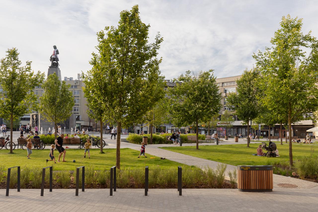The initial criticism of the bold greening of the square—unprecedented on a national scale despite a significant shift in the shaping of public spaces—subsided when the completed project became one of the residents' favorite places, shifting the focal point of the city center.