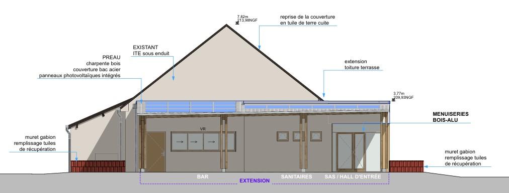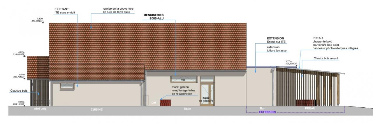 - Expand the building for better comfort for users and the neighborhood: relocation of the entrance on the south side with the creation of an awning overlooking the Seille, creation of a bicycle room on the north side, creation of a bar area in the extension to free up space (accessible inside and outside), creation of a storage room for tables and chairs