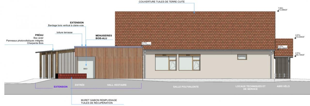 Inaugurated in 1987, the village hall has never been renovated or brought up to significant standards until today. Following the last safety commission, the evolution of society in communities and new needs, as well as the aging of the building and current installations, it has become necessary to undertake repair work, to bring it up to standards in particular PMR, and to do this to enlarge the existing building.
