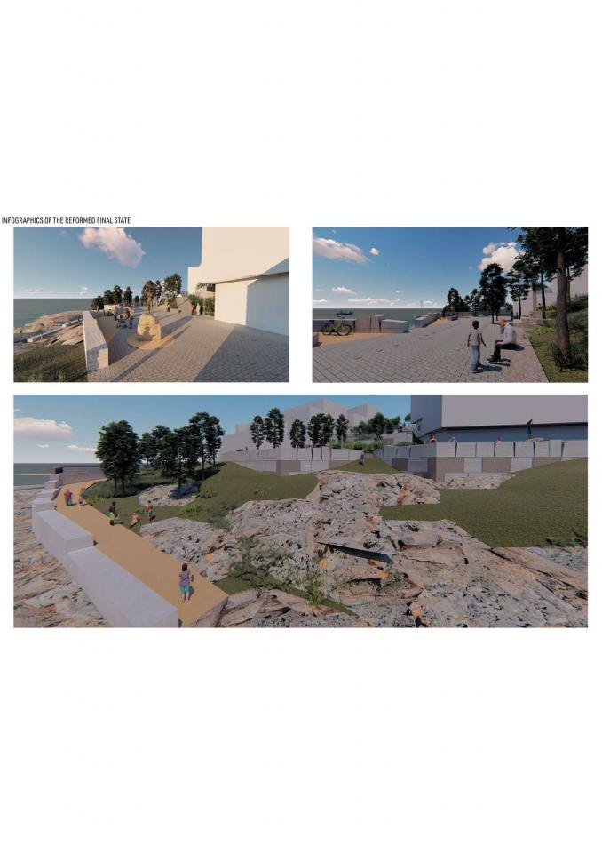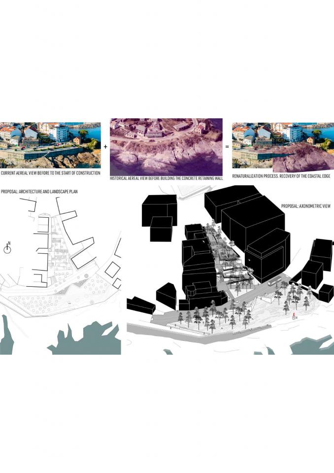 Among the main objectives of this project is to eliminate, in the as much as possible the architectural, visual and environmental barriers present, so chooses to dismantle part of the current large retaining wall (as far as the maritime-terrestrial delimitation) in order to re-naturalize and decontaminate the coastal front and, in Consequently, to improve the landscape and functionally the connection of the core with the sea. To do this, in addition to demolishing the wall and trying to recover the previous territory and landscape through a topography reconstruction work in detail, new tree species will be included native (Atlantic pine).