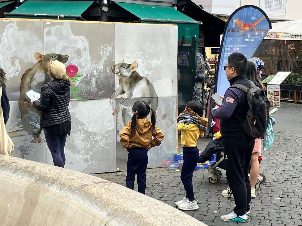 All the people (citizens and tourists) were involved in the project on multiple levels. At the beginning, they were engaged through art in the creative process (emotional level). Then, they were included by the scientists in the environmental issues for which we are all responsible (awareness level). In the end, they were connected to the social media pages (Facebook and Instagram) related to the development of the project and, above all, to the ISPRA guidelines and the Life-ASAP social web page. Most of them agreed to be photographed and their portraits were displayed on the artworks (active level), empathizing with the Invasive Alien Species (divergent thinking). The experience with the popular school of Testaccio neighbourhood was very interesting: it’s a multi-ethnic educational institution where the inclusion of foreign children was very heartfelt. There, the defence of the multifaceted nature of biodiversity was very impactful. The artistic performative actions (live painting) that took place in the beautiful squares of Rome were completely accessible to everyone and served as a perfect urban theatre to convey the environmental and social messages of the project. The architecture of the magnificent squares was enhanced by the artworks, creating a pleasant surprise among the public, who expressed their appreciation for such free of charge events and congratulated the municipal administration for financing such an itinerant artistic initiative. The live painting performance was an inclusive and interactive way to convey important social values.