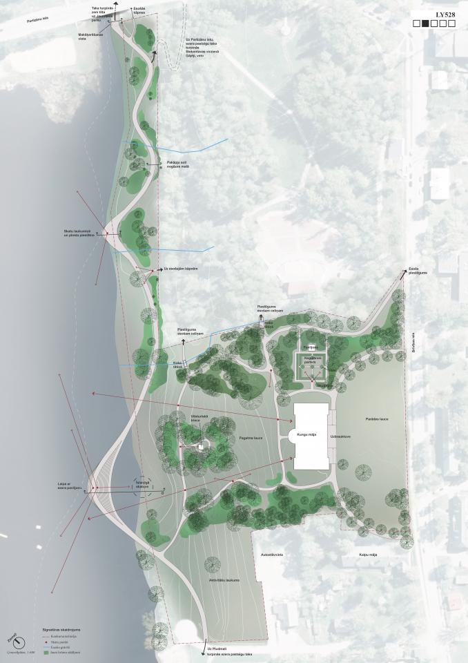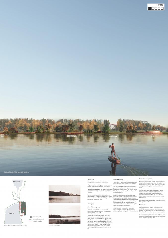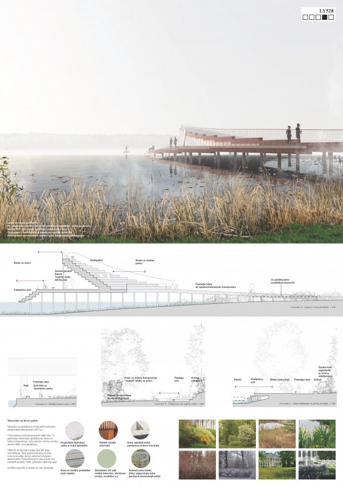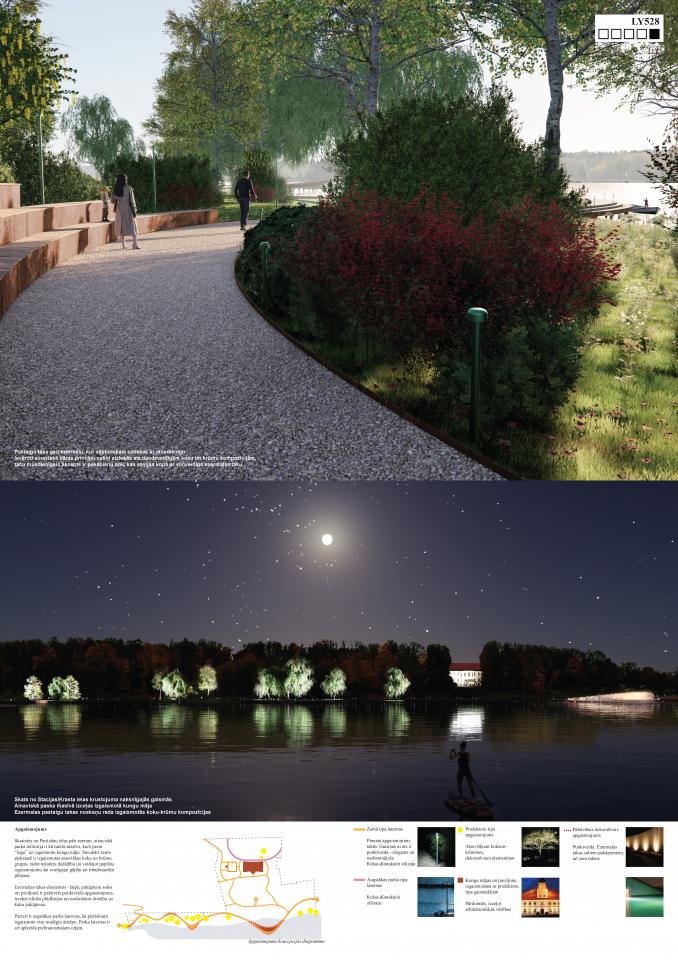 The proposal combines the cultural and historical beauty of the manor park with the contemporary beauty of the lakeside walking path. These two spatial solutions each in their own way create an experience for the visitor. Without revealing everything at once, but rather showing and hiding a particular view, the path curls up behind the bushes, only to reappear and lead the visitor hesitantly to the next chosen view. In the Manor Park, visitors travel back in time - wooden benches, romantic paths, a "hidden" geometric parterre garden with a reconstructed wooden pavilion, old trees, shrubs and other elements with a 19th century aesthetic. In the lakeside, which is spatially separated from the estate park by a steep slope, all the landscaping is designed in a modern wave form - the path, the stepped benches, the squares and the steps to the water are all integrated into a single flowline.