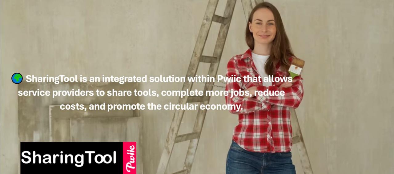 SharingTool innovates by combining collaborative and circular economies to address the limits of traditional tool rental and purchase models. Unlike conventional rental platforms, which are costly and centralized, SharingTool relies on a network of local providers who make tools available, making access more affordable and inclusive. Artificial intelligence automatically suggests required tools when a service is posted, optimizing resource use. Additionally, Pwiic operates as a cooperative, allowing providers to become shareholders, ensuring participatory governance and direct user involvement.