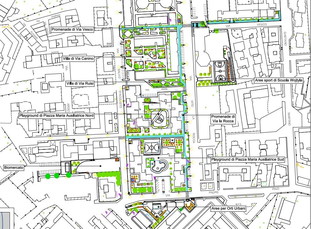 The project aims to foster urban integration and economic revitalization by promoting a model of an inclusive, sustainable, and well-being-oriented city. It achieves this through the regeneration of degraded urban spaces, combining sustainable infrastructure, inclusive practices, and the enhancement of cultural and artistic heritage. Target Groups: Neighborhood Residents: Young people, families, and older people facing economic and social challenges. Youth and Students expanding educational and recreational opportunities. Local Organizations and Institutions: Schools, associations, religious institutions, social housing agency and fire departments to support urban culture and education. Local economy: small businesses, farmers and artisans involved in revitalized markets. Visitors and tourists: attracted by cultural regeneration, public art and urban transformation. Specific Objectives: Sustainability: Create green spaces such as urban gardens and greenhouses. Promote soft mobility through cyclepaths and pedestrian routes. Social Inclusion: Converting enclosed spaces into open areas, fostering interaction through meeting spaces, events, sport and cultural activities. Cultural and Artistic Enhancement: Develop a Public Art Park with street art and themed furniture. Promote educational and artistic activities tied to the neighborhood’s identity and heritage. Local Economic Development: Redevelop the neighborhood market to support local producers. Attract shops, caféés and other businesses to revitalized areas.Expected outcomes: Improved Quality of Life: Reduce social deprivation and inequality. Enhance safety with lighting and video surveillance.Increased Urban Attractiveness: Transform degraded spaces into functional, welcoming and visually appealing areas. Boost visitors and tourists through cultural revitalization. Economic Growth: Create opportunities for micro-enterprises and local associations. Foster greater environmental and social awareness in the community.