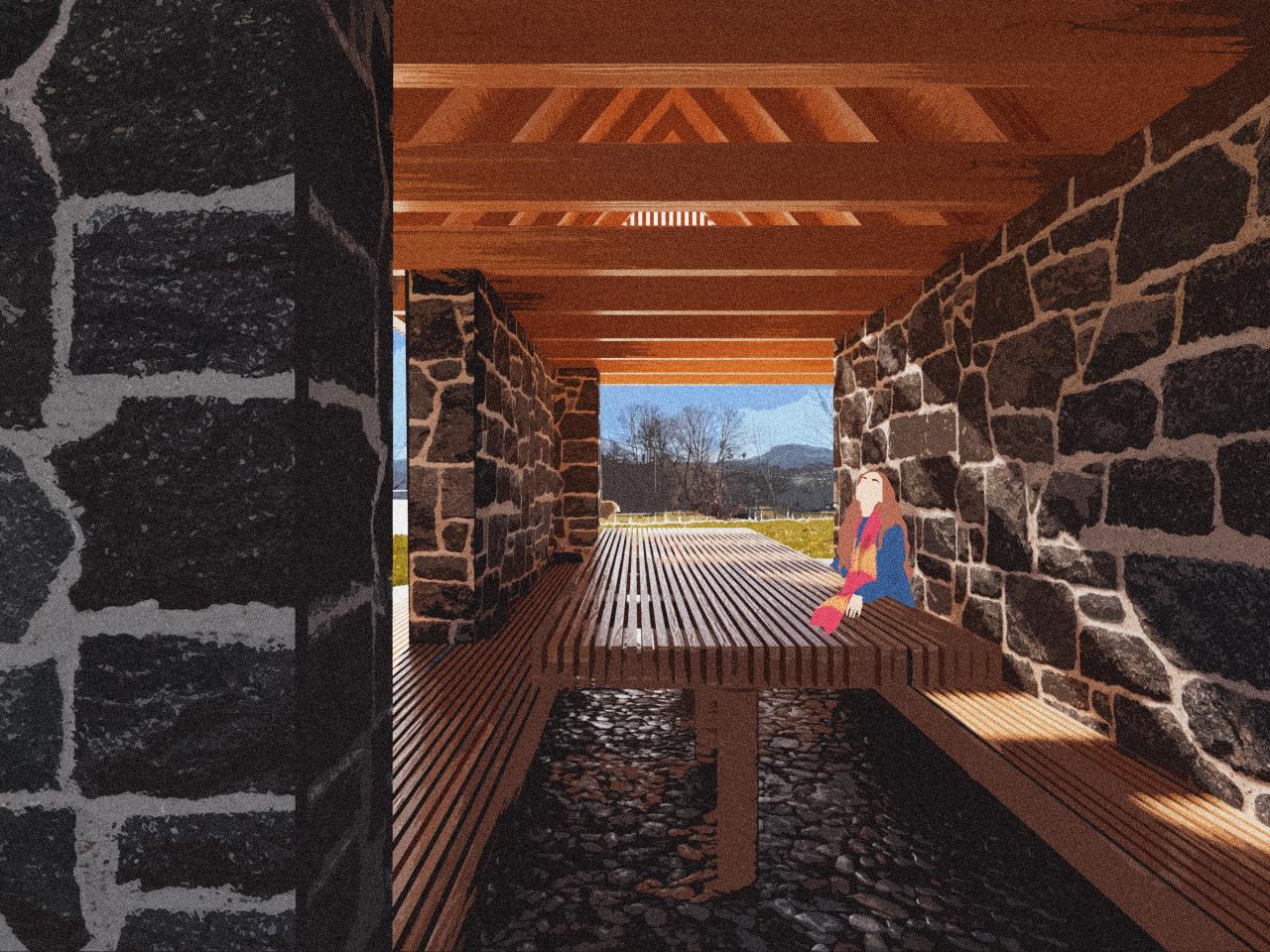 The scale and proportions of small-scale vernacular architecture, through the use of timber structure and the detailing of sheds, henhouses and barns will be transferred and implemented into the architectural. Local basalt stone will be used as a tribute to the ruins of Szanda Castle.