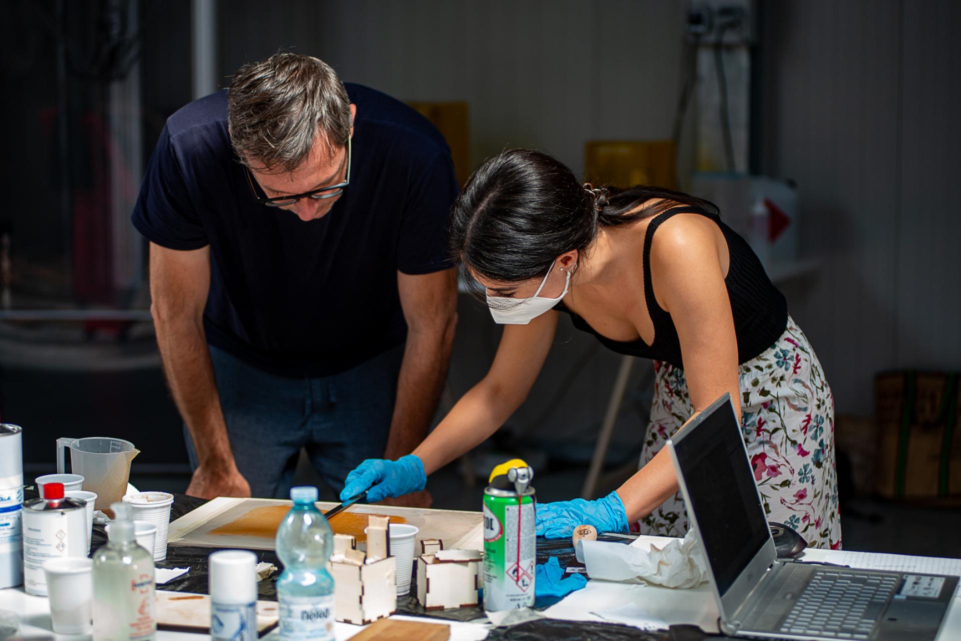 Organizing this type of workshop in a small town was a challenge. We weren't sure that students from bigger cities would have enjoyed the experience in a small city. The results were extraordinary; we were able to offer an educational workshop with an international mood in a small city. We like to call our experiment an internationally local design workshop, where local students met with students from bigger cities, with workers, where participants met with internationally known designers, all in a small town of Le Marche, learning new ways in their field while being able to get to know a new territory, made by its community and its story. A collective experience in which tutors, staff and students collaborated with great cohesion and harmony on a common project. The final exhibition aimed at visualizing the process and phases that each group followed during the working week. It was decided to place all the tests carried out on the ground following the logical order of succession of the work. Alongside the physical tests, we asked the participants to explain the contents of the tests and the percentage of used waste through legends. The ultimate goal was first of all to visualize the knowledge emerged during the analysis, design, and construction phases as a whole. Secondly, to share and compare the results obtained by the different development teams and, finally, to encourage students to tell a story of experimentation through the configuration and visualization of the objects as a whole. The residue from the production of chair no. 14 generated continuous surfaces, plasters, materials, coatings, colors, printable papers, tiles, slabs, vertical partitions, walking sticks. Each of these experiments wanted to translate, through a process of data physicalization, data into tangible and visible artifacts to tell the extraordinary innovation introduced by this company in woodworking. Small tangible tales of Gebrüder Thonet Vienna's environmental ethics.