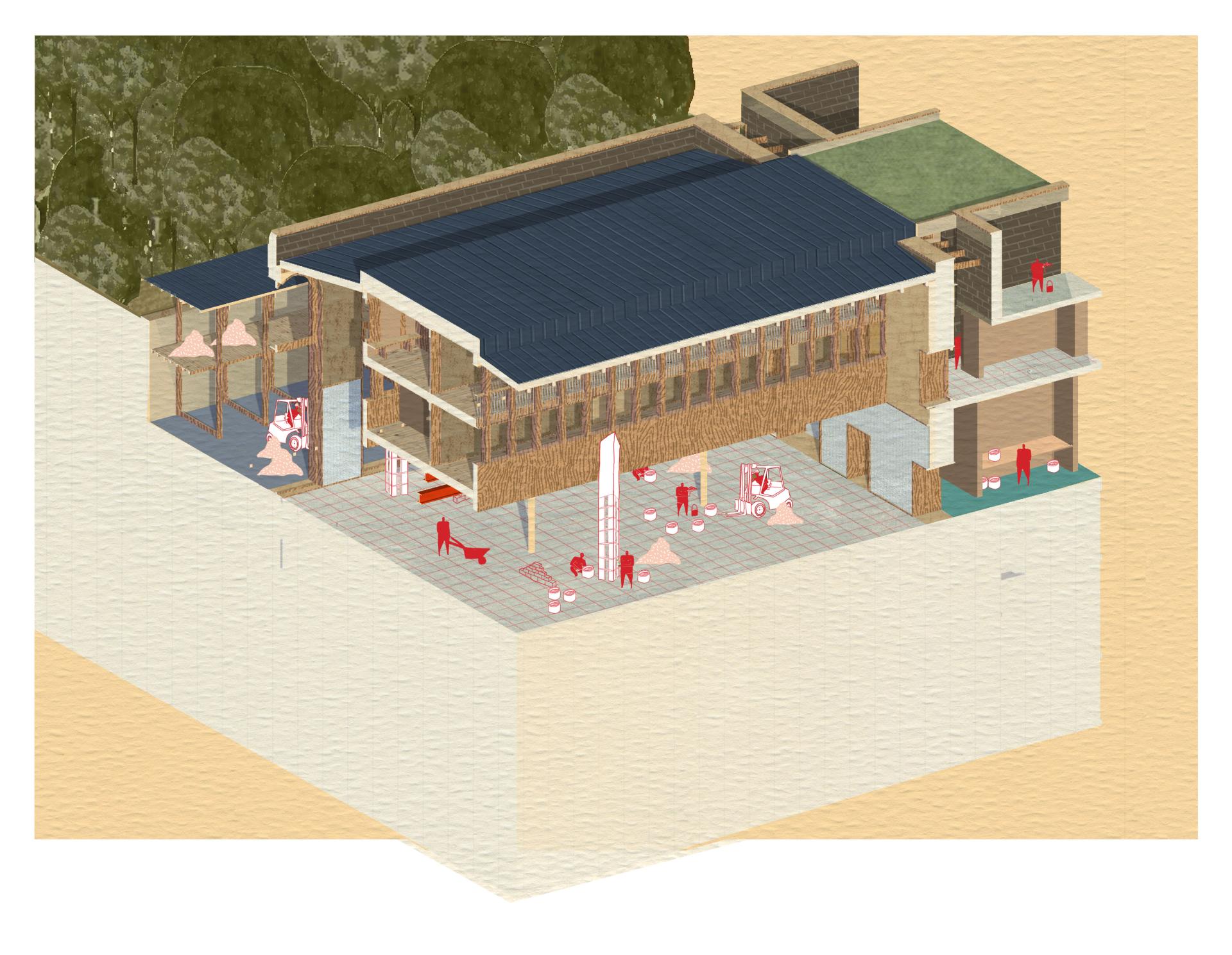 The « Architecture Center for regenerative materials » is thought as an eco-system, a place to experiment, raise awareness and produce around the regenerative materials. We propose, as a first step, to substitute industrial materials by, as much as possible, natural materials, which require less carbon during their production.