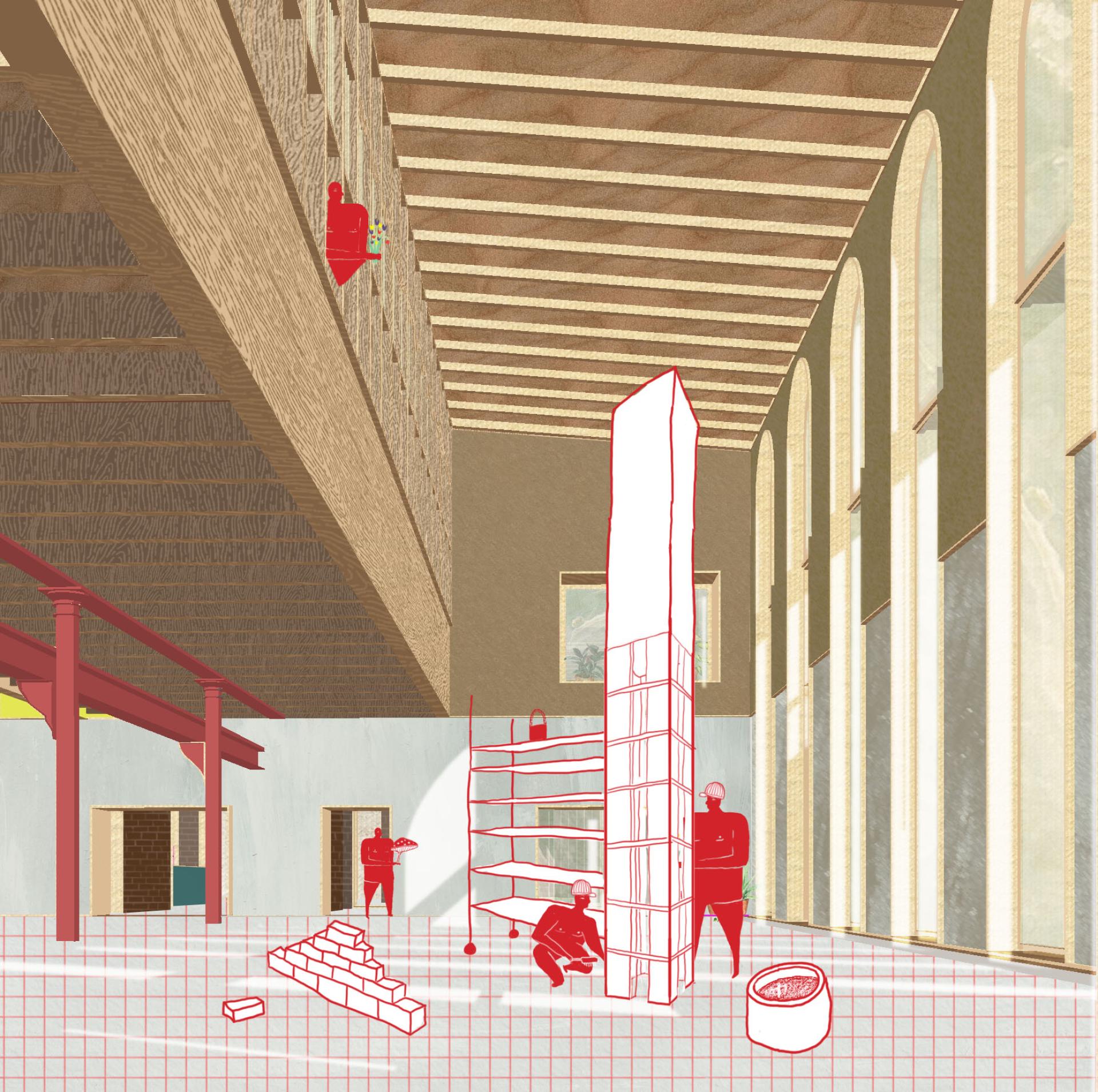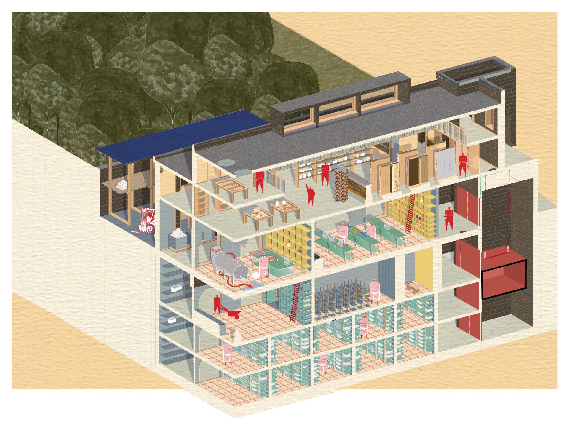 The building is divided into three parts. Firstly, the « Micro-Factory » is a producing place where insulated growing mycelium-based panels are produced on its basements. Growing panels drive us on a post-carbonated direction for construction, facing both the reduction on the use of raw materials and the thermical renovation issue, while transforming empty floors in producing places. The overhaul of construction production methods must accompany a broader agricultural policy, on a national or even transnational scale, with the North of France and the Netherlands. As a congested European metropolis, integrated into the network of the European megalopolis, Brussels is dependent on supply circuits for raw and, above all, processed materials. We would suggest that the metropolitan area could accommodate production sites for materials based on plant fibers and mycelium, in order to be able to supply the entire built fabric of Brussels.