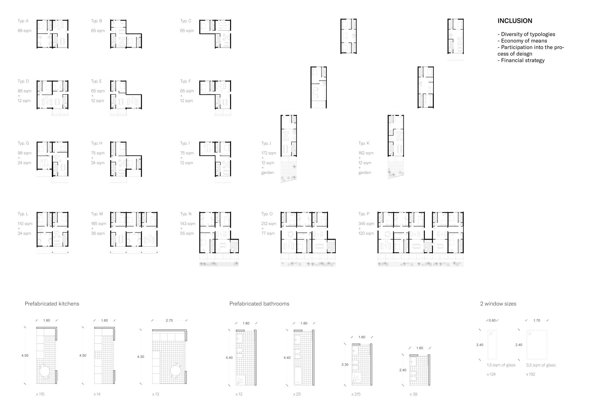 As for reaching affordability for a good quality of housing, with generous spaces, indoor’s as much as outdoor’s, developed in many various ways in order to address the wider range of living’s types possible, has been imagined through economic strategies. Using industrialised production, repetitive construction, and the sequencing of similar modules allows larger spaces and better quality of experience. In particular in this project, components of that economy of means are: prefabricated bathrooms, prefabricated kitchens, declination of only two window’s sizes and cross-wall construction.