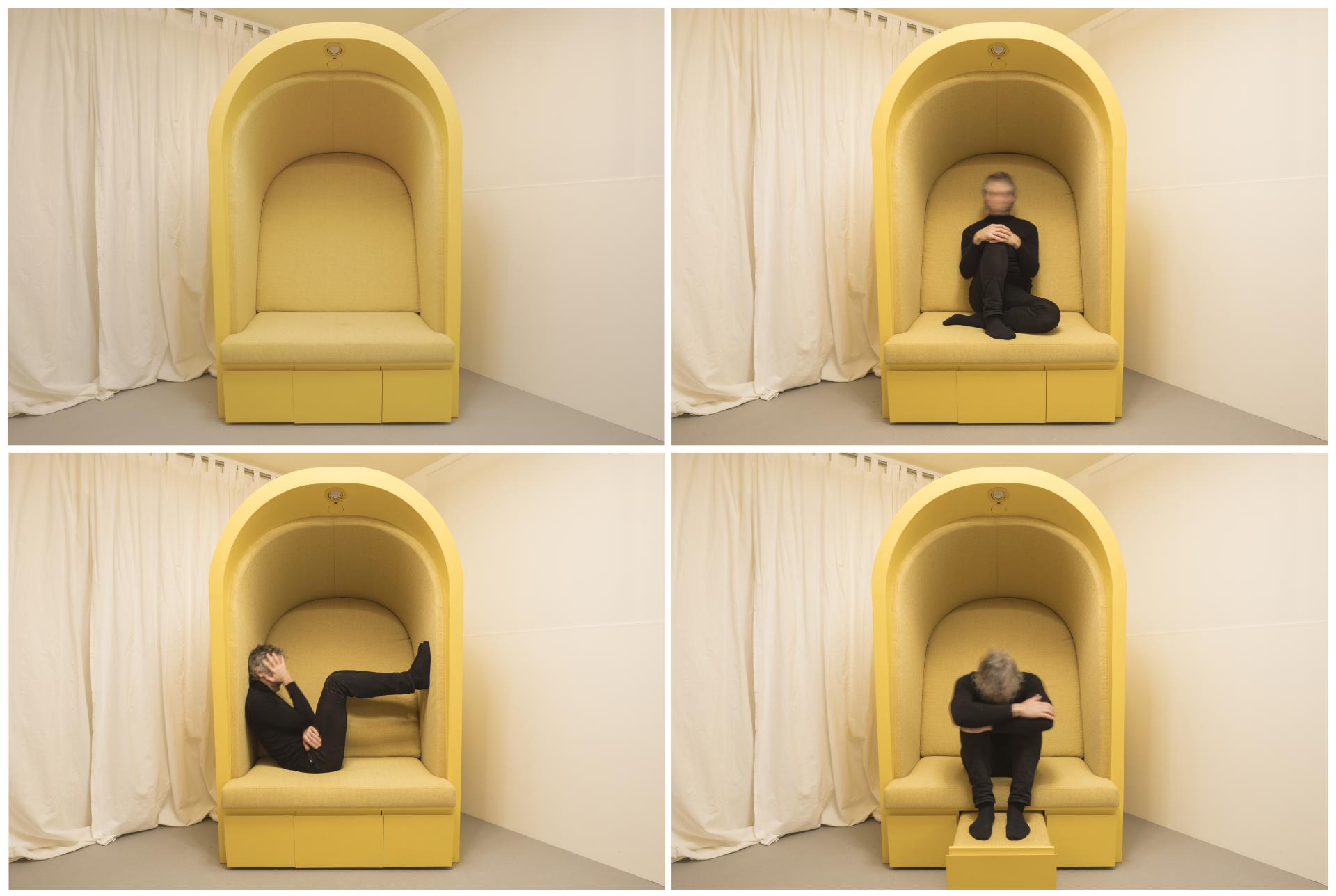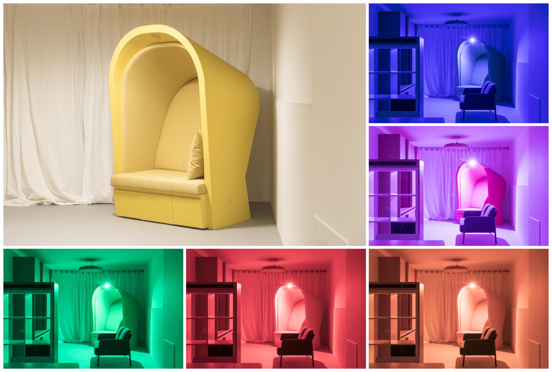 The shelter seat we designed is a space that holds and protects the person inside. The person could sit, crouch, relax and calm himself, finding a sensory balance. It is deep and large. The structure is made in curved wood panels with washable and sound-absorbing soft textile element inside. The seat is integrated with coloured and dimmer light and different types of sensors that are connected to the network for the detection of hazardous events (microphones, accelerometer, air quality detection and so on).