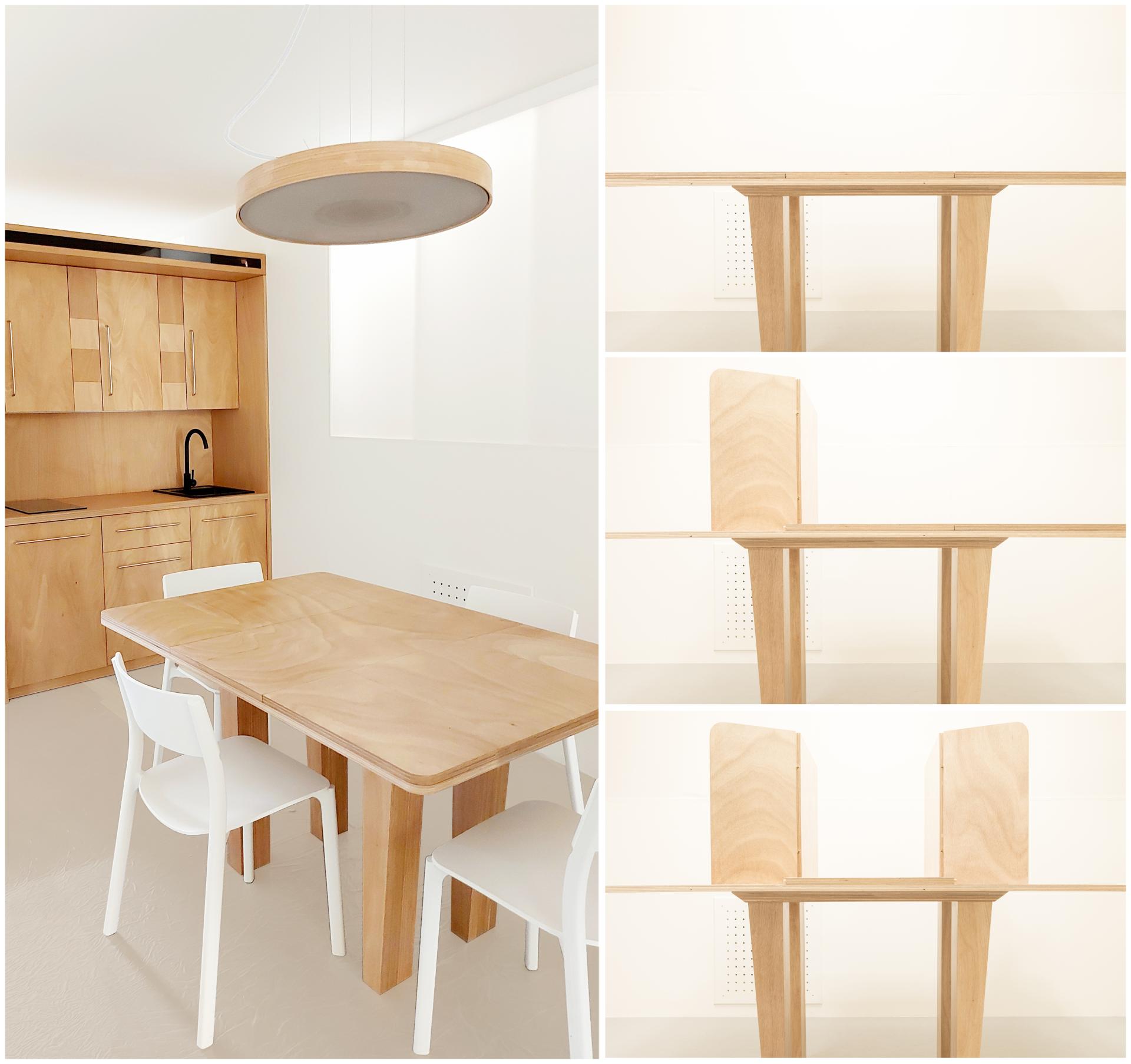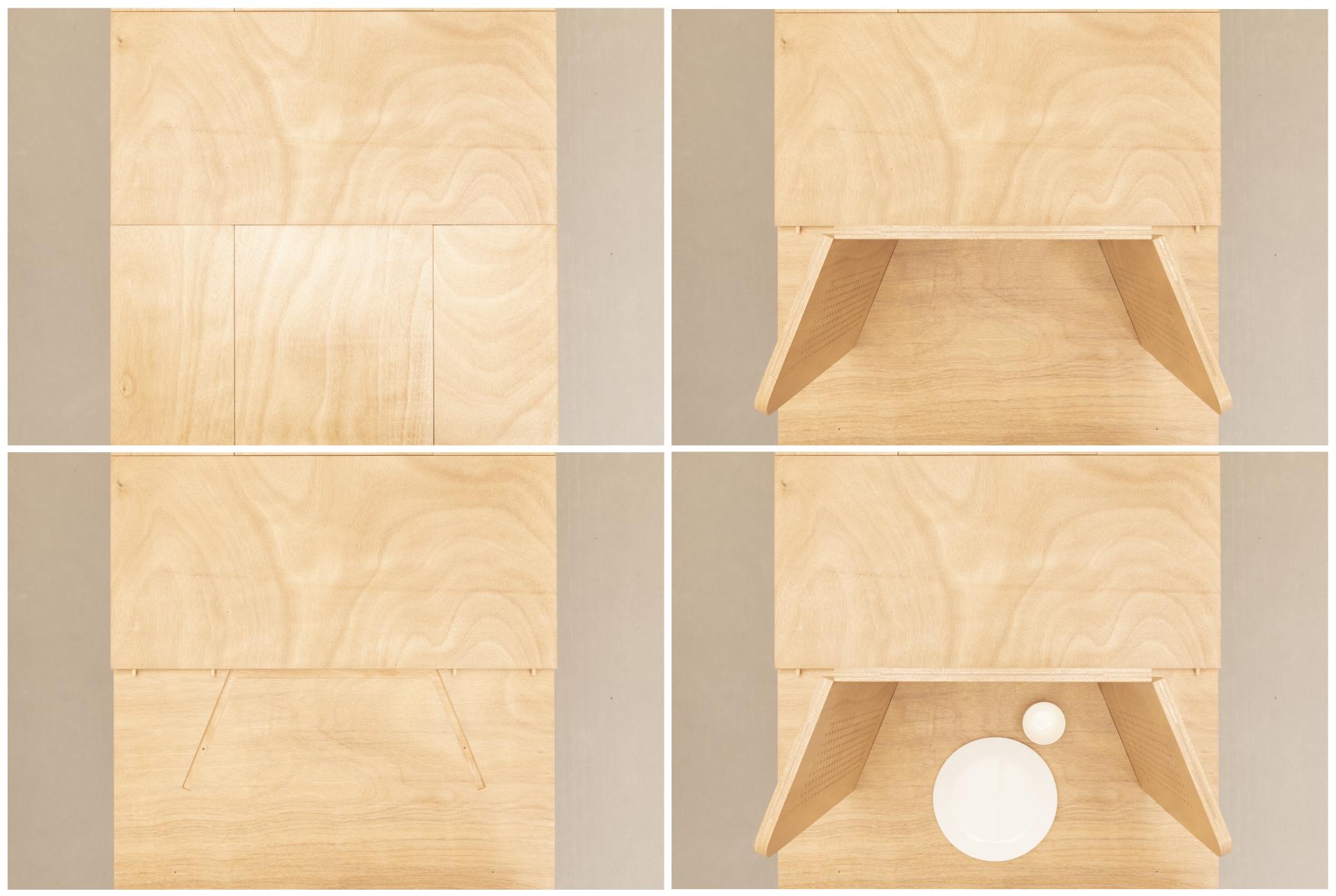 The table with dividers gives the possibility to create a physical separation from each other when eating or studying, focusing on food (or homework) remaining in the same place (without exclusion). It is equipped with removable front and side dividers. When need it, the person can bring out dividers to isolate him/her from view, smells, and sound. The dividers partitions are performed to offer sound-absorbing function, helping to improve acoustic comfort during the meal and are completely washable. Four vibration sensors will be placed underside the table sending an alarm signal if it is moved.