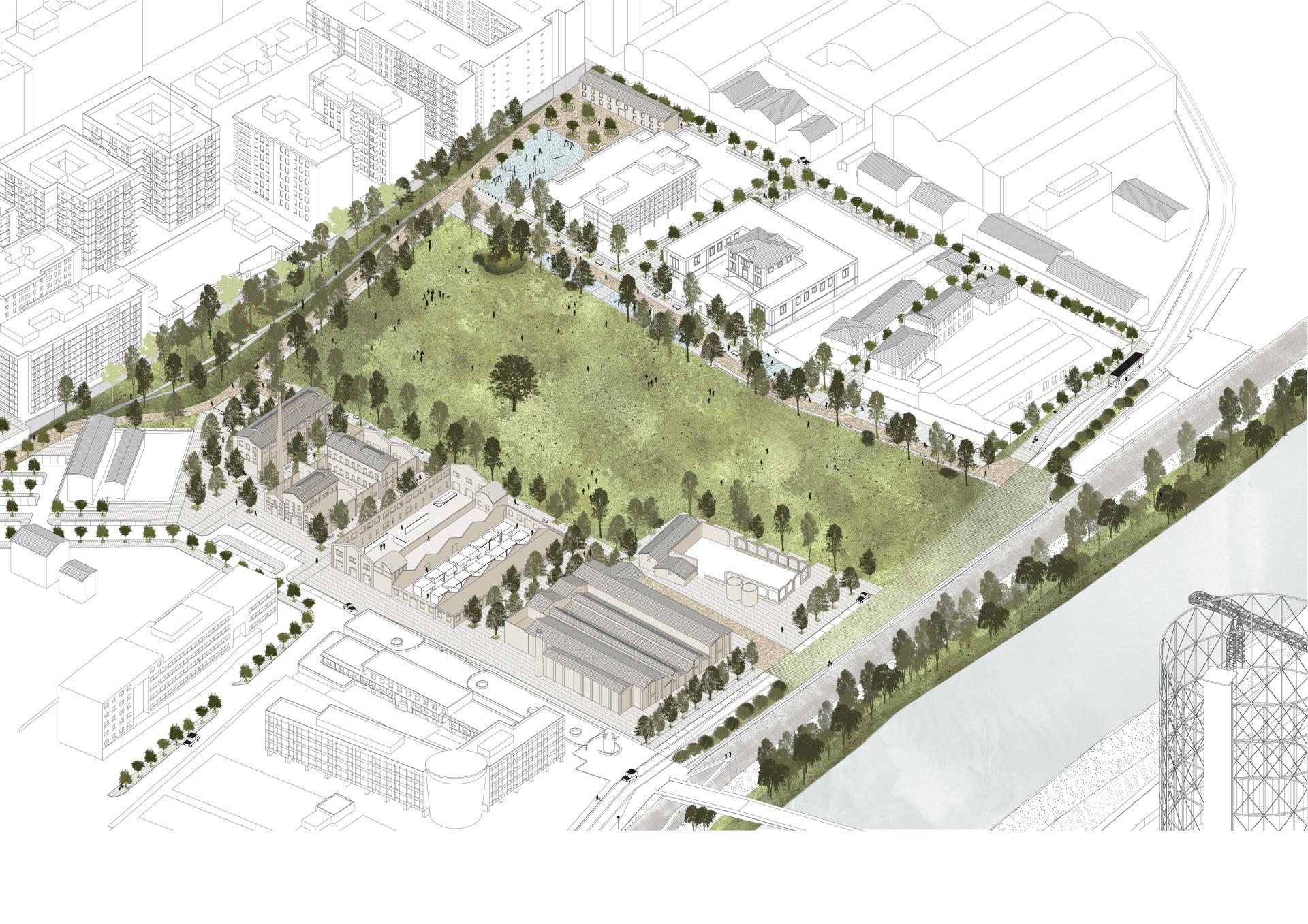 The main objective of our initial concept was the refunctionalization of the factory’s ruins for the Marconi neighborhood’s benefit, but a more thorough analysis was crucial to identifying the lack of physical and functional connections between the city and the Papareschi area as the primary issue. That meant that any project focused solely on the buildings would be destined to fail, as it wouldn't connect the buildings to the citizens. In addition, a study of the area and the neighbourhood highlighted a serious insufficiency, both of gardens and parks, compared to the dense population of Marconi, despite the unexpressed potential of the surrounding river’s floodplain.