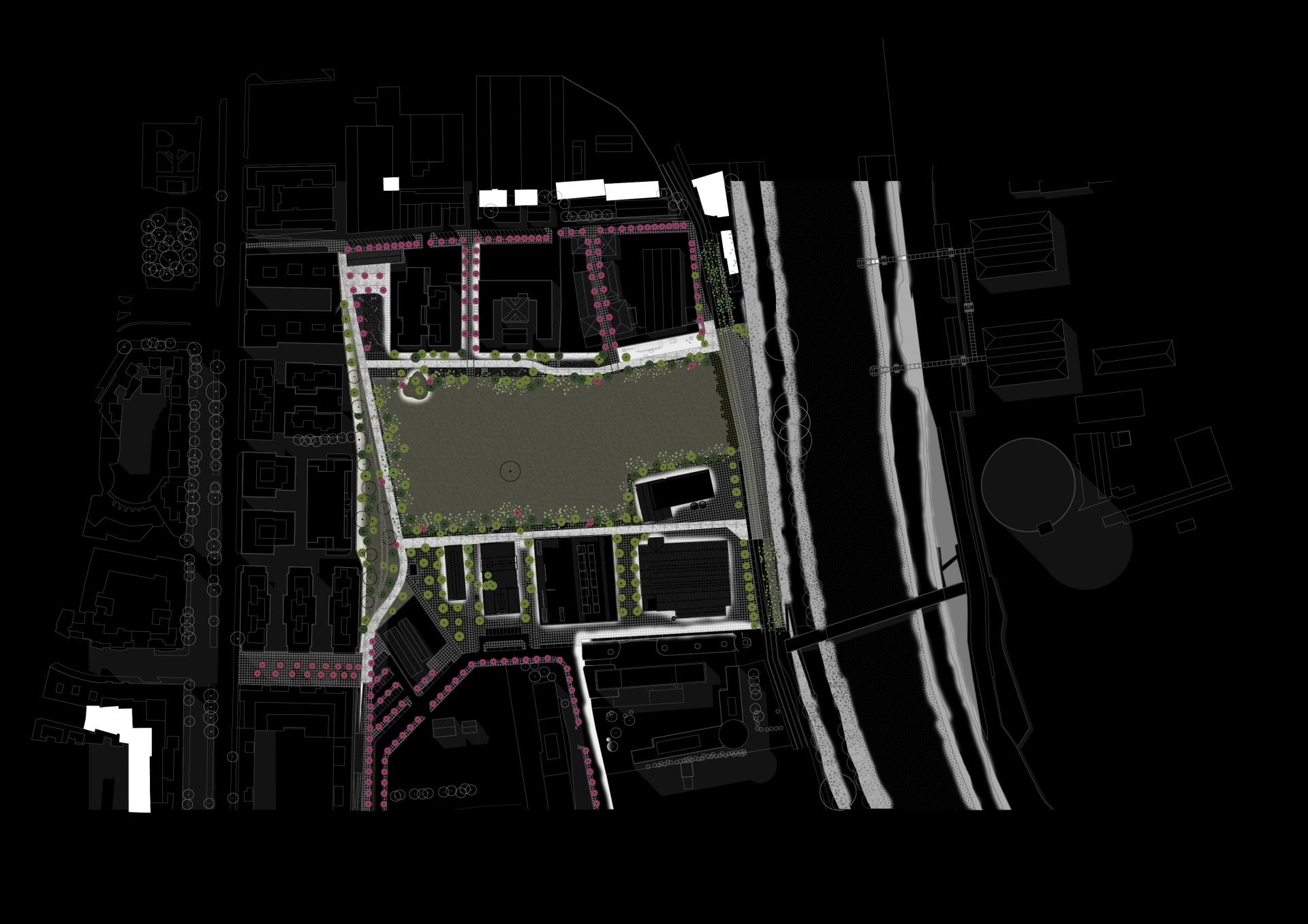 Therefore, in accord with the citizens’ instances, the idea for the area was to create a park. The wilderness of the site transforms from problem to solution, and its growth is encouraged, rather than stopped. The presence of trees and bushes is even increased and expanded outside the site and into Marconi to create the weft of connections that is needed to integrate the park within the neighbourhood. The large and central void made out of a self-generated meadow is preserved and its well-being is fostered by a biannual mowing, with the double goal of creating an accessible collective space during spring and summertime, and encouraging the necessary biological renewal of the plants in fall and winter. New trees and bushes are planted on the edges of this prairie, and the primary species (Alnus glutinosa, Populus tremula and Salix purpurea nana) are chosen to mirror the riparian species of the Tiber. Other smaller trees which are common in the city, such as Cercis siliquastrum, are used as a further tool for connection.