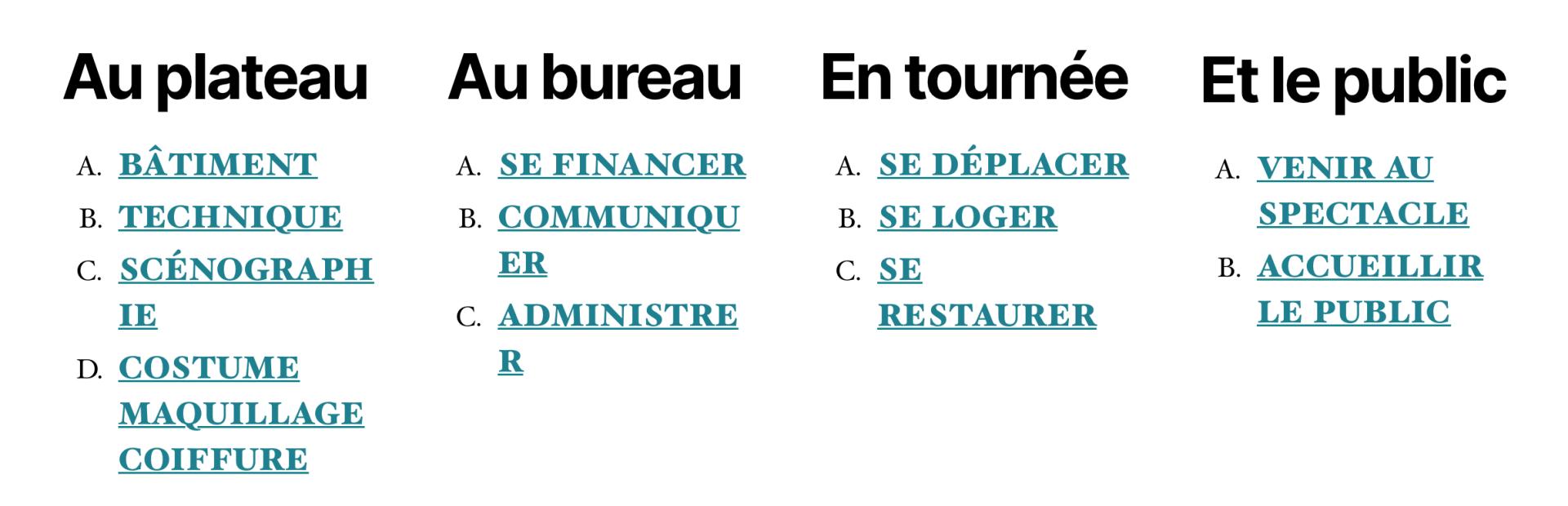 Furthermore, as a network our goal is to promote the actors and their initiative toward fighting climate change. It felt unnecessary for us to apply our aesthetics on their actions. This why Arviva’s Action Handbook is designed like a web or small wiki based on hyperlinks making it easier for us to compile all information accessible from other channels (word to mouth, research programs, websites, expert advises.) but hardly accessible for the performing arts professionals untrained or unaware of sustainability best practices.