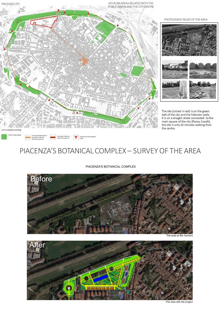 I propose to integrate an eco-sustainable complex in an abandoned area in the city of Piacenza, Italy. This space would be transformed to a recreation area where people can meet and learn something about biology in a botanical park, take a walk in a green area and relax in their spare time.