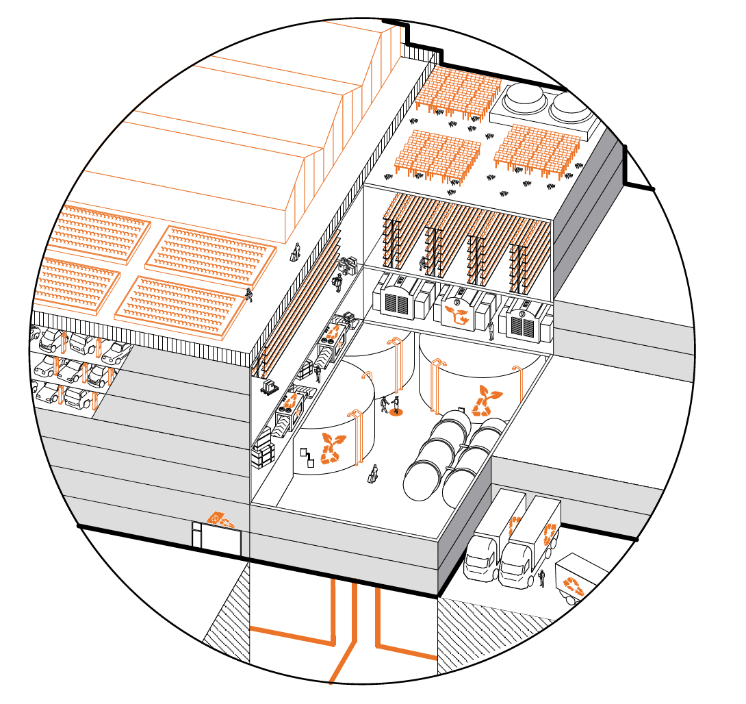 The Circular Systems Concept helps the new urban district protect resources and the environment while meeting the requirements of the new ways of working. The Multilayer City will be resilient and future-proof. The goal of efficiency and functionality of the neighbourhood is pursued. The circular system is divided into the goods, the nutrient, and the energy cycle. The processes of those cycles are spatially bundled in the CIRCULAR CENTRE in the south-west of the area. This facilitates exchange within and between the circuits.
