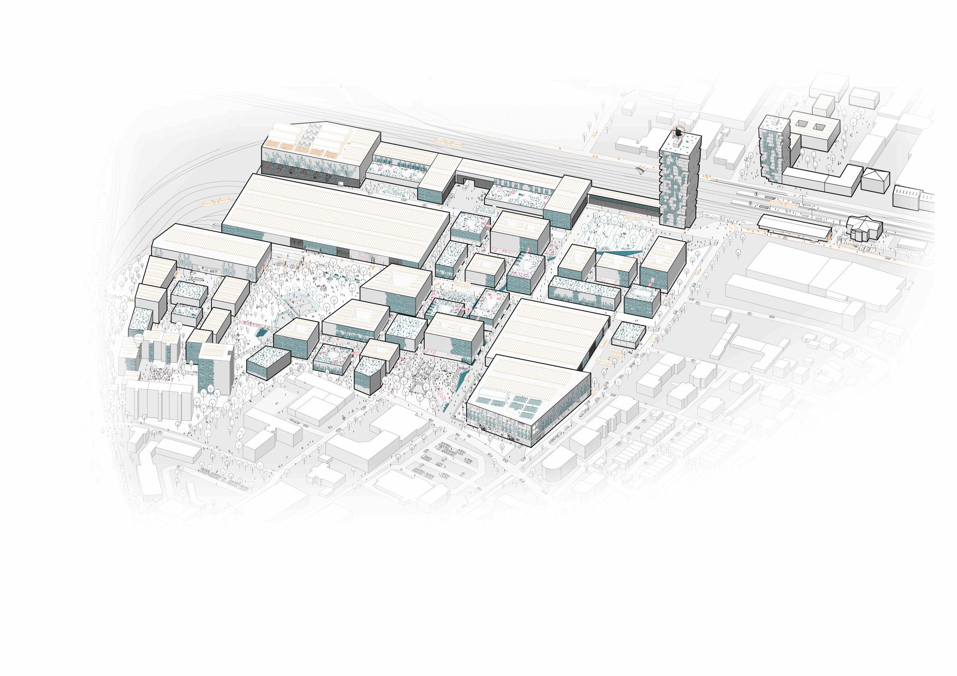 The design Multilayer City aims to create a place in the city of Ettlingen with unlimited forms of living and working. As a future industrial quarter, an innovative urban design is intended to demonstrate possibilities for the living-together of tomorrow . Therefore, numerous communication areas are essential. At the neighbourhood level, several public pocket parks are formed to promote exchange between all users. The public squares are oriented towards the main access routes. One large square is located nearby the train station. Its scale creates a cooling effect, and its design and the surrounding architecture create an inviting atmosphere that welcomes the arriving people to the multilayer city. An additional identification feature are two tower blocks, which can be seen from a great distance and connect the quarters to the east and the west of the railway tracks. The visitor experiences nature as the most important companion for a future-proof economy. Thus the buildings' facades and roofs are covered with plants. This creates semi-public spaces on the buildings roofs and in the immediate neighbourhood, creating an interface between public and private sections.