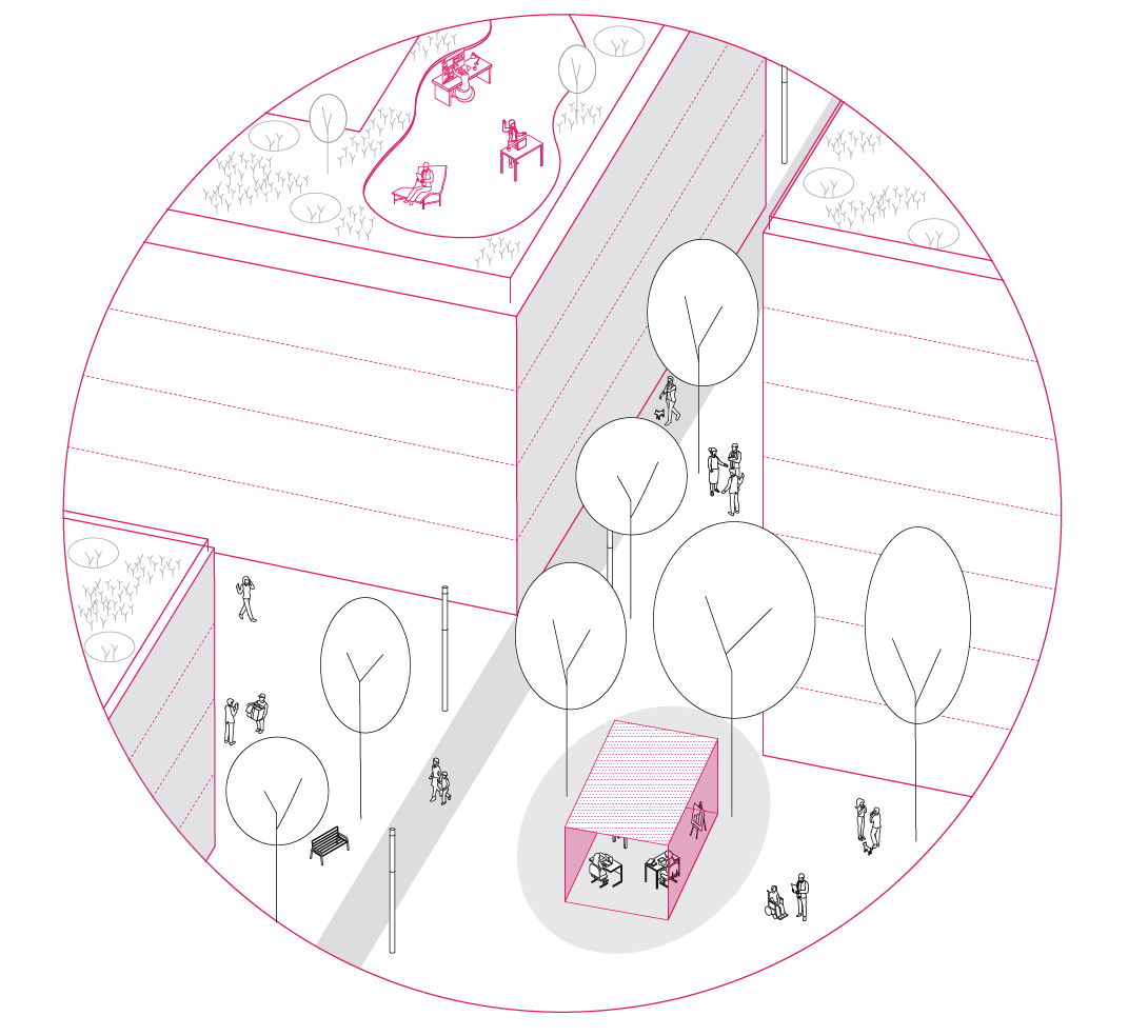 The office-buildings should be open 24/7 with digital access. By that, workers and other players can use the building and its infrastructure at any time according to their preferred working hours.