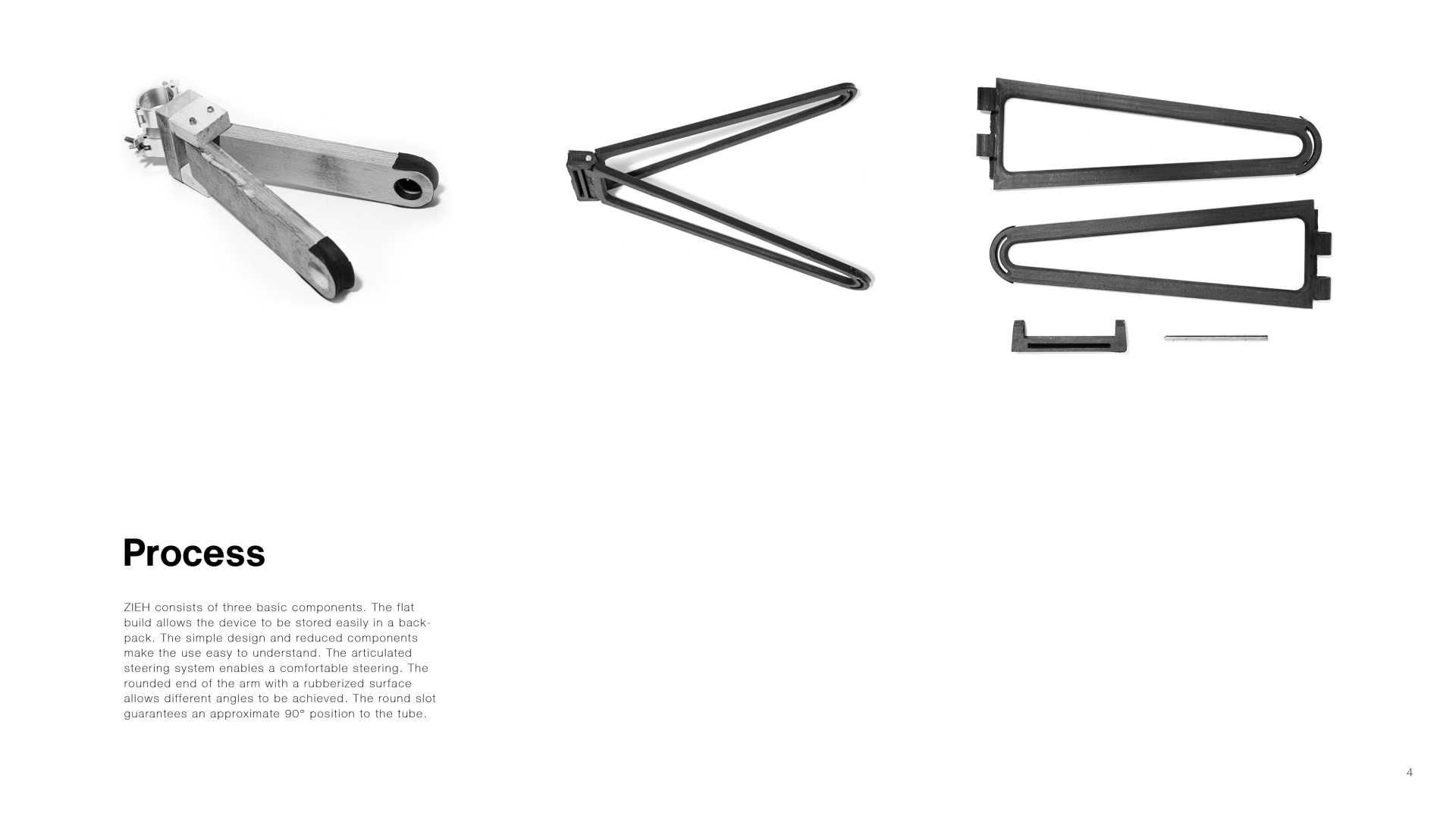ZIEH consists of three basic components. The flat build allows the device to be stored easily in a backpack. The simple design and reduced components make the use easy to understand. The articulated steering system enables a comfortable steering. The rounded end of the arm with a rubberized surface allows different angles to be achieved. The round slot guarantees an approximate 90° position to the tube.