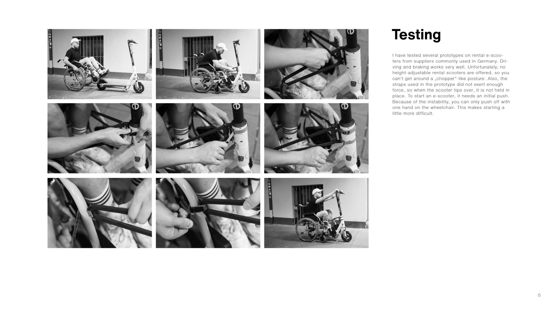 I have tested several prototypes on rental e-scooters from suppliers commonly used in Germany. Driving and braking works very well. Unfortunately, no height-adjustable rental scooters are offered, so you can‘t get around a „chopper“-like posture. Also, the straps used in the prototype did not exert enough force, so when the scooter tips over, it is not held in place. To start an e-scooter, it needs an initial push. Because of the instability, you can only push off with one hand on the wheelchair. This makes starting a little more difficult.