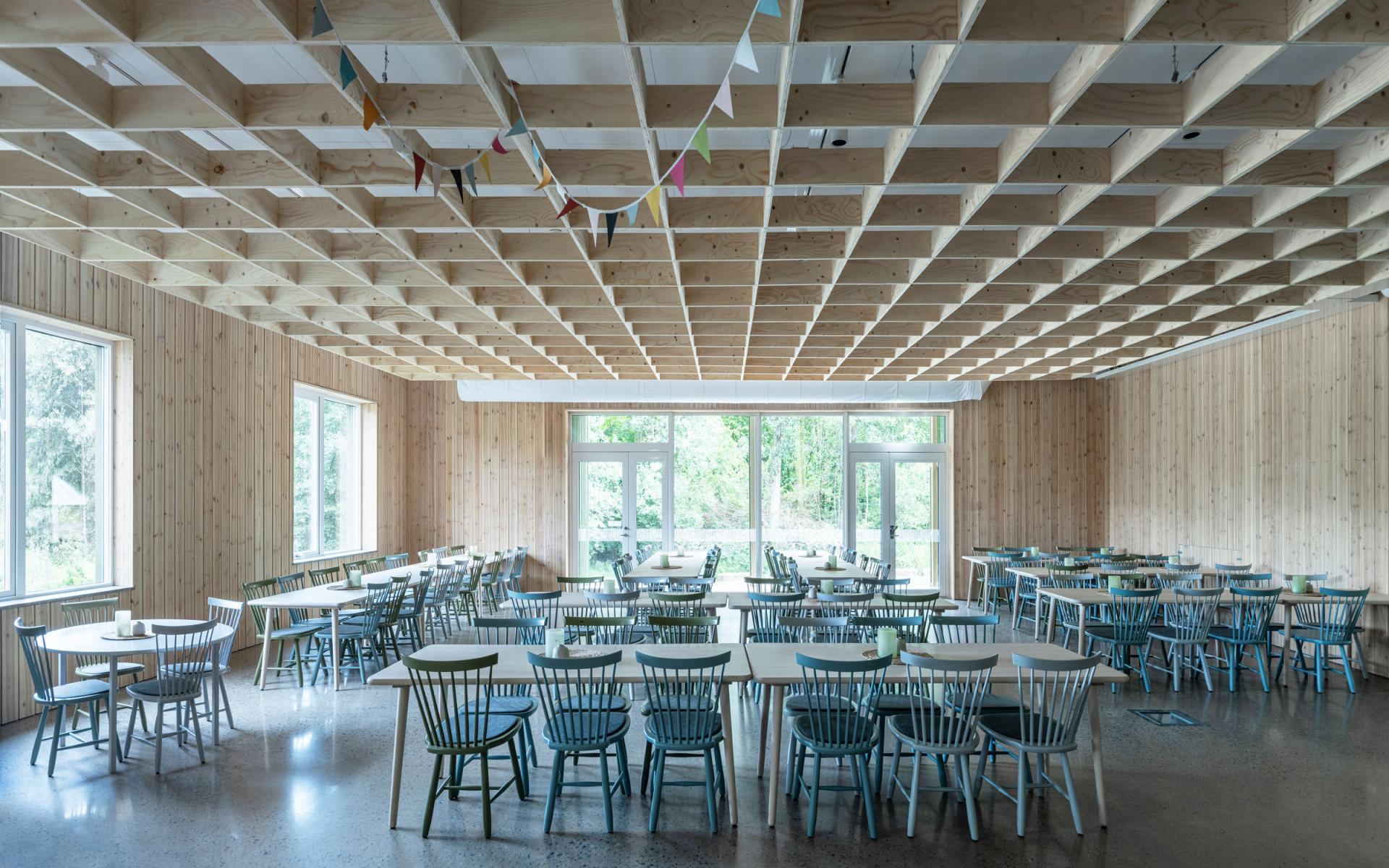 Recycling and upcycling and the use of wood benefits sustainability. It also makes a building beautiful. Wood is a material with a warm feeling and it creates soft acoustics when you move around. The church is entirely built with locally grown wood. The furniture is made of oak from the nearby area.