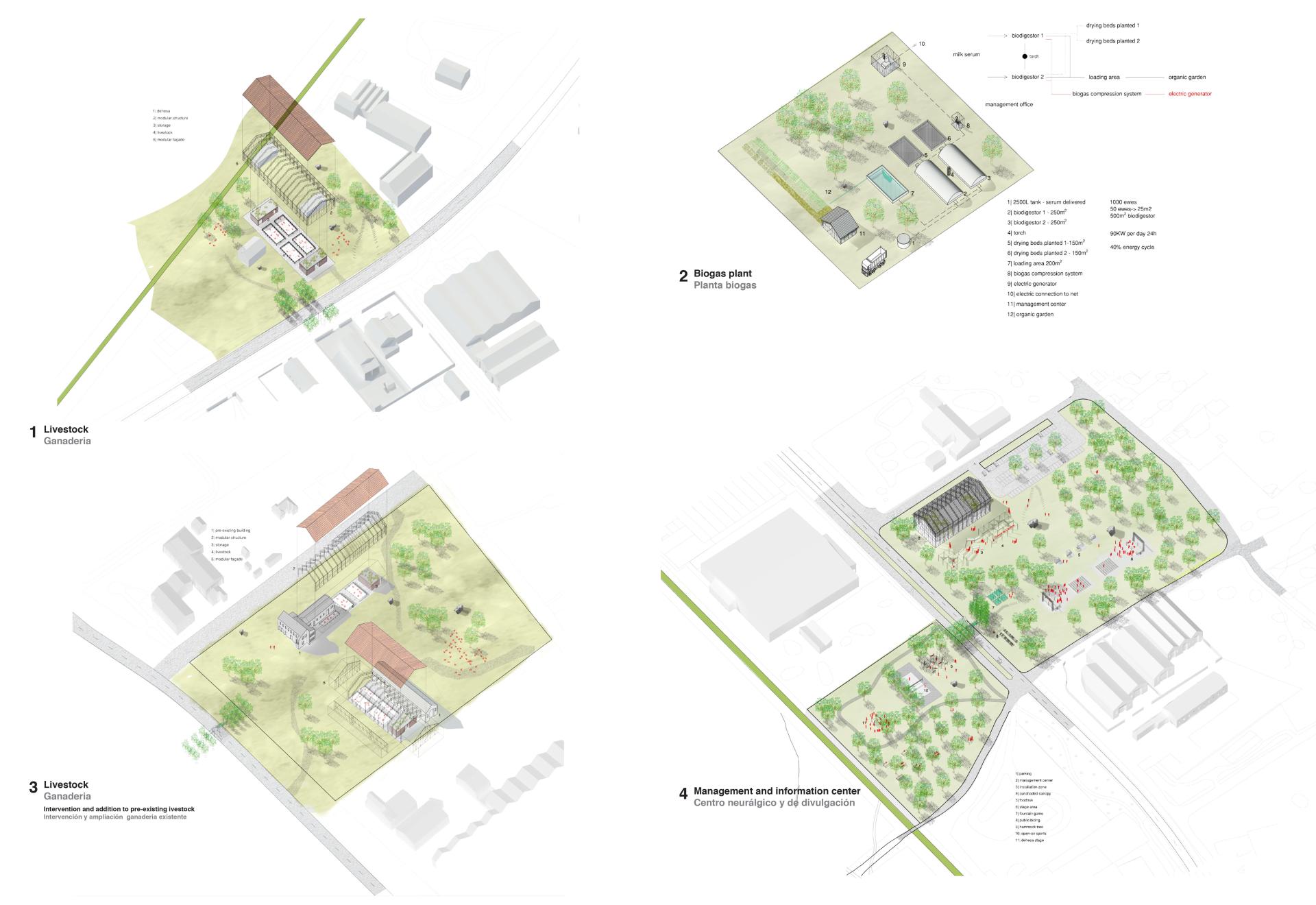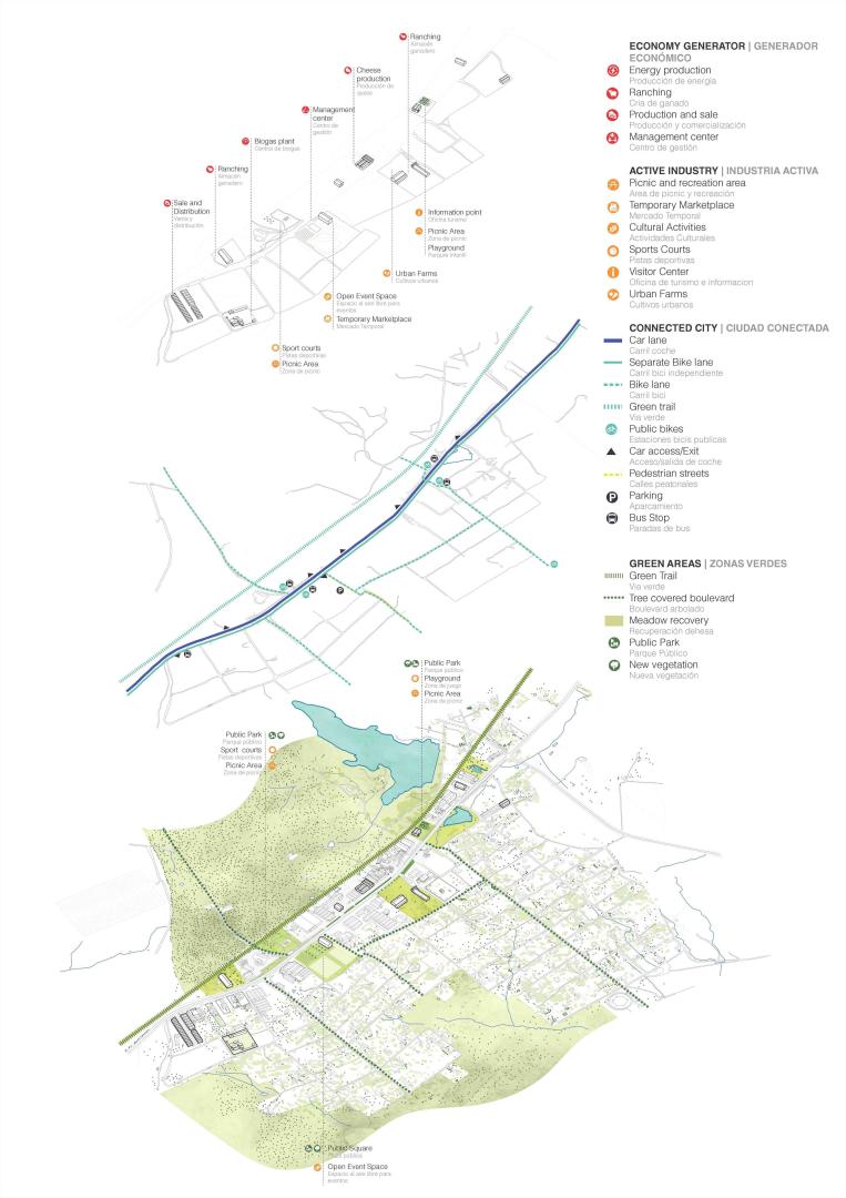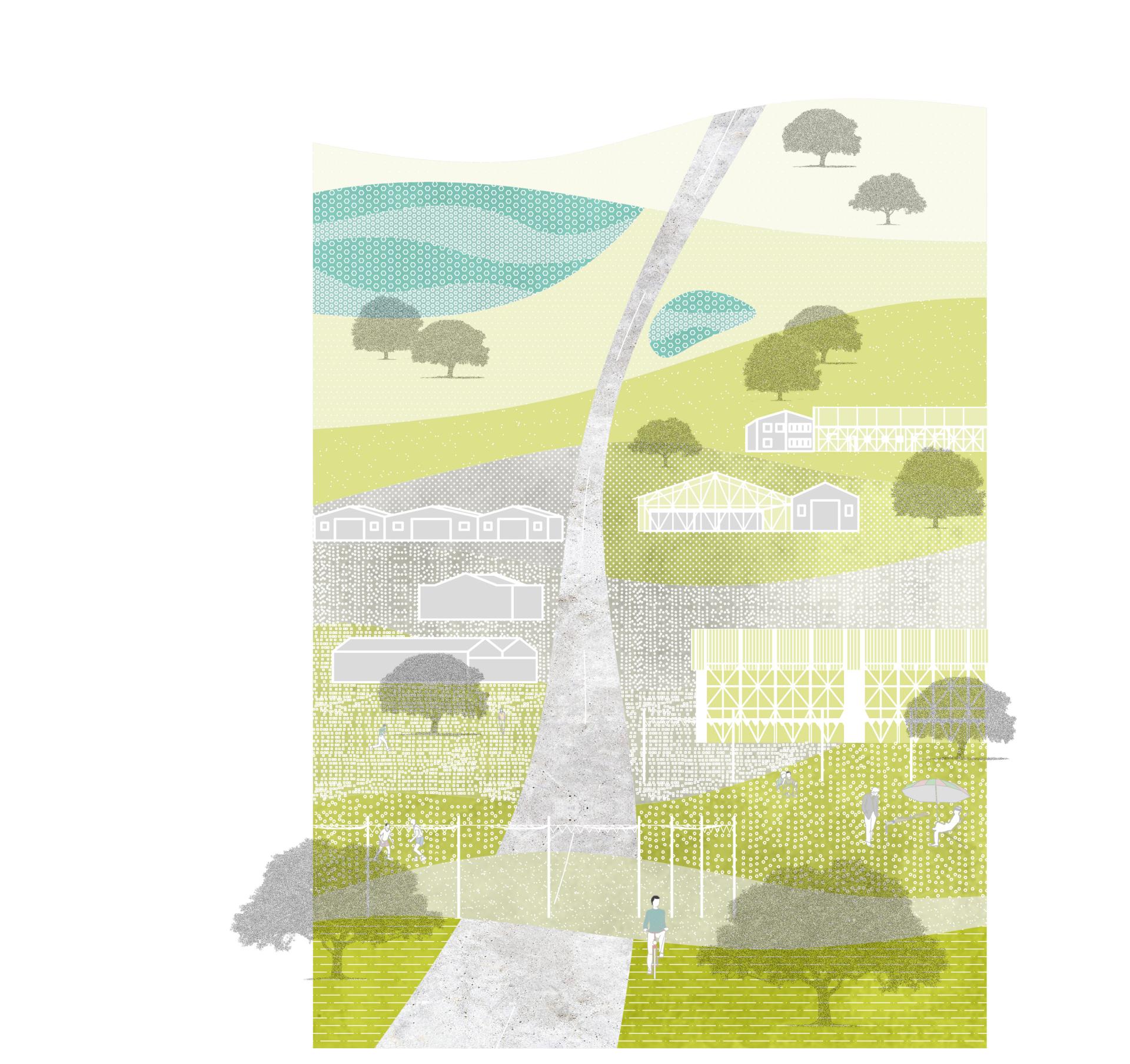 Public plazas are proposed where seasonal activities will take place, as well as temporary installations that will modify the space. Where new architecture is required to supply the current urban needs, modular elements are implemented, a transparent and light architecture that blends with the landscape. These elements can be modified depending on the evolution of the activity they host. We generate a place where different programs coexist, and at the same time, a pleasant environment in which to live and work is created. Thus, from the implementation of a complementary industry, we can build a hybrid between city, countryside, and industry, ultimately an ecological city that is productive, and a better place to live.