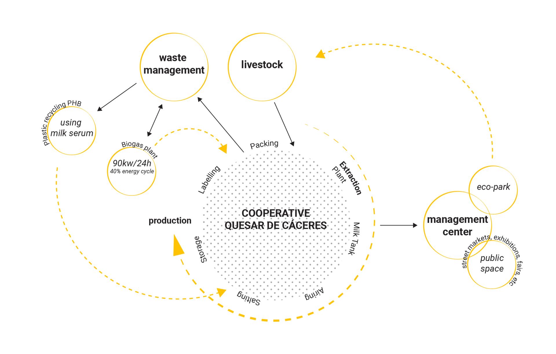 The main objective of the proposal is the development and implementation of a new sustainable production model that will enhance the value of existing systems, contribute to local progress, help stabilise the population and satisfy new demands that are generated with the associated growth. Following the foundations of the traditional economy of the region, stockbreeding and cheese production, a circular cooperative model is proposed where the small producers, as well as new companies in the area, find the necessary infrastructure to develop their activity. Technological innovation is incorporated to optimise the process, promoting the prosperity of the industry without compromising our sustainability goals.