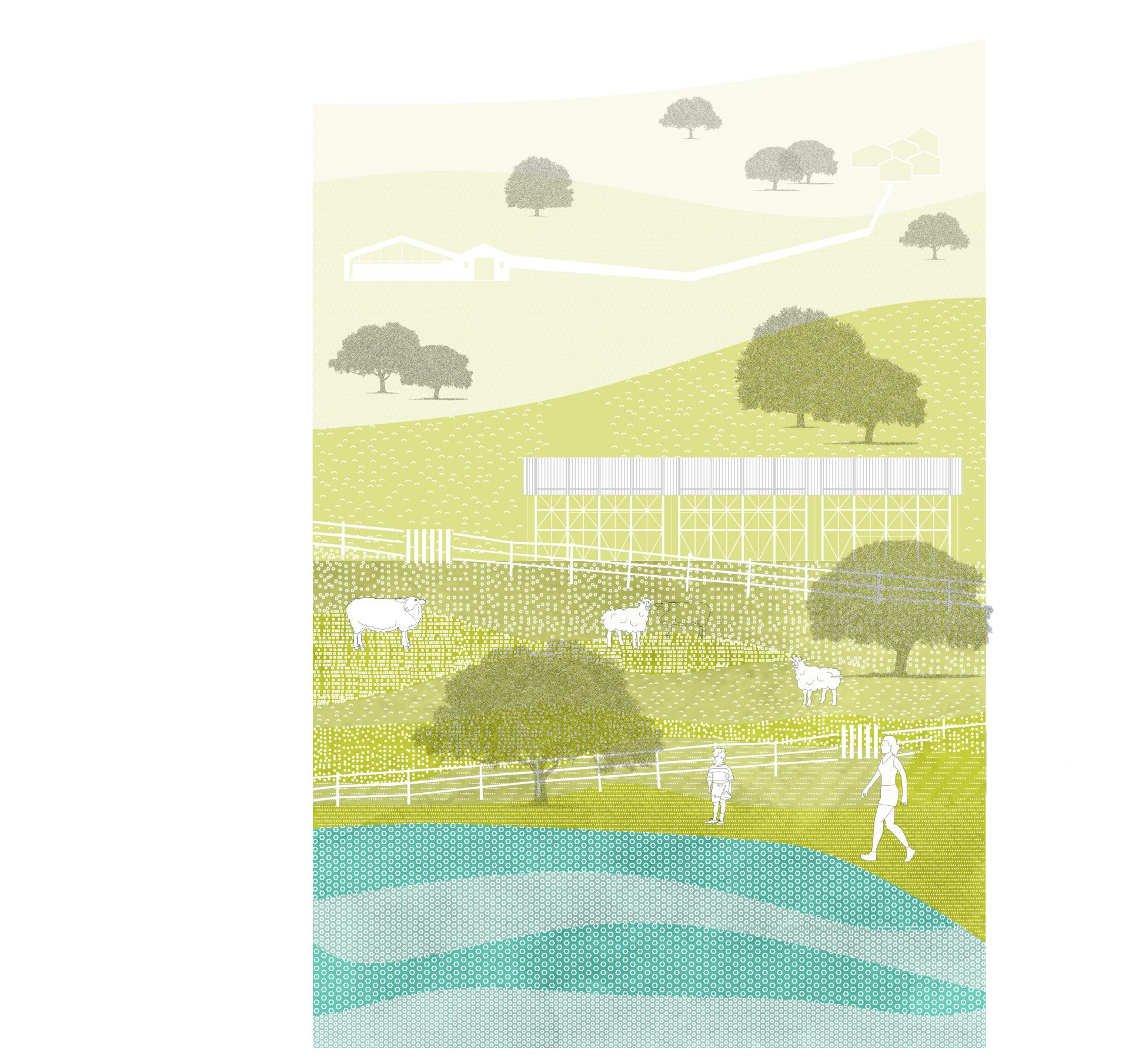The economic and social model proposed in Quesar de Caceres is based on a circular production cycle that rethinks the image of the city and respects the surrounding landscape, engaging all of the agents of the community and making them the main developer of their system. The implementation of the production model takes into consideration the gradual growth of the community, where local agents intervene to coordinate the actions taken. With great focus on the recovery of the existing landscape, what used to be an abandoned hostile industrial area, becomes a new centre for prosperity where nature comes back into the city and takes a fundamental role in the wellbeing of the inhabitants.