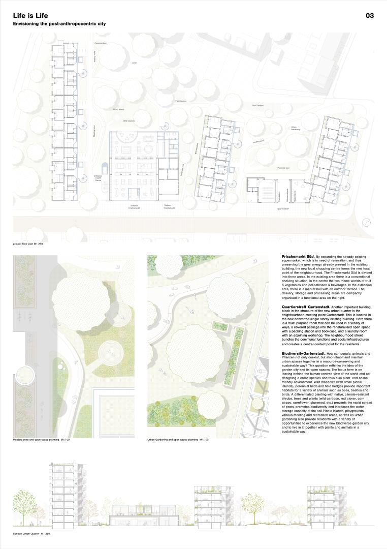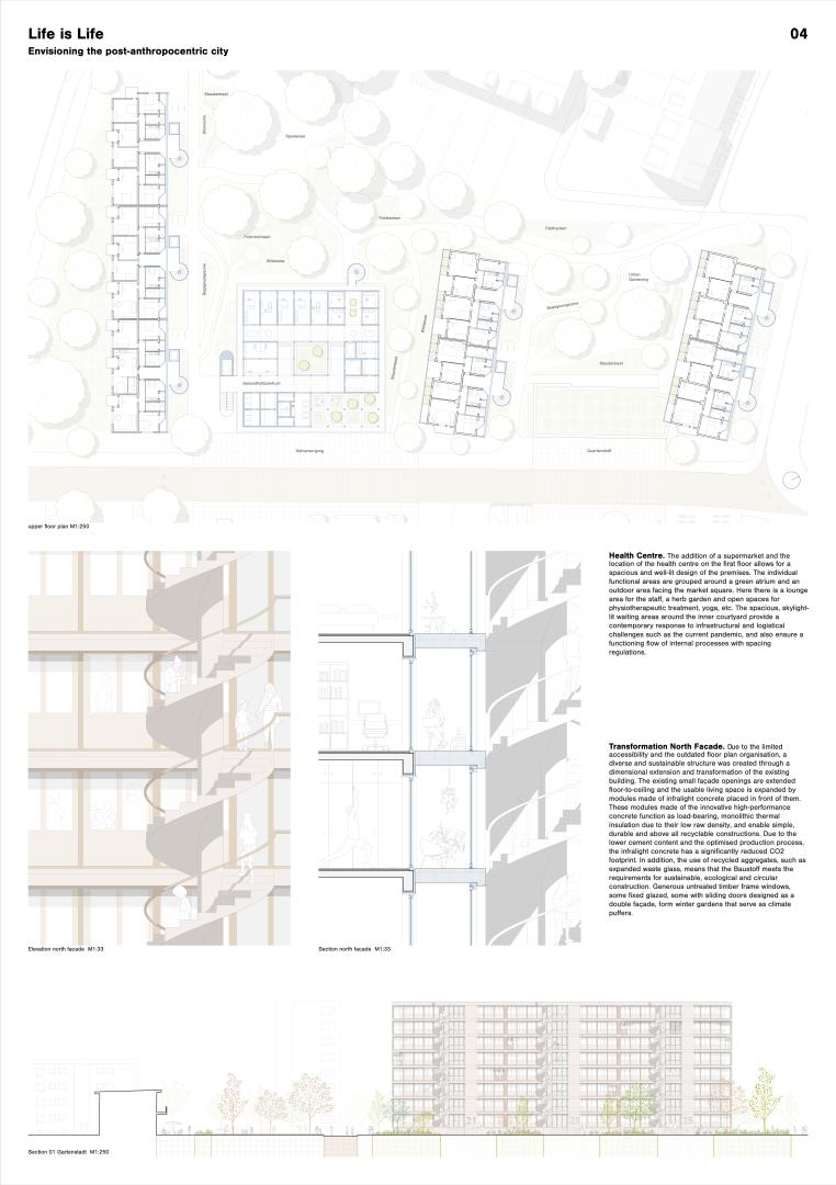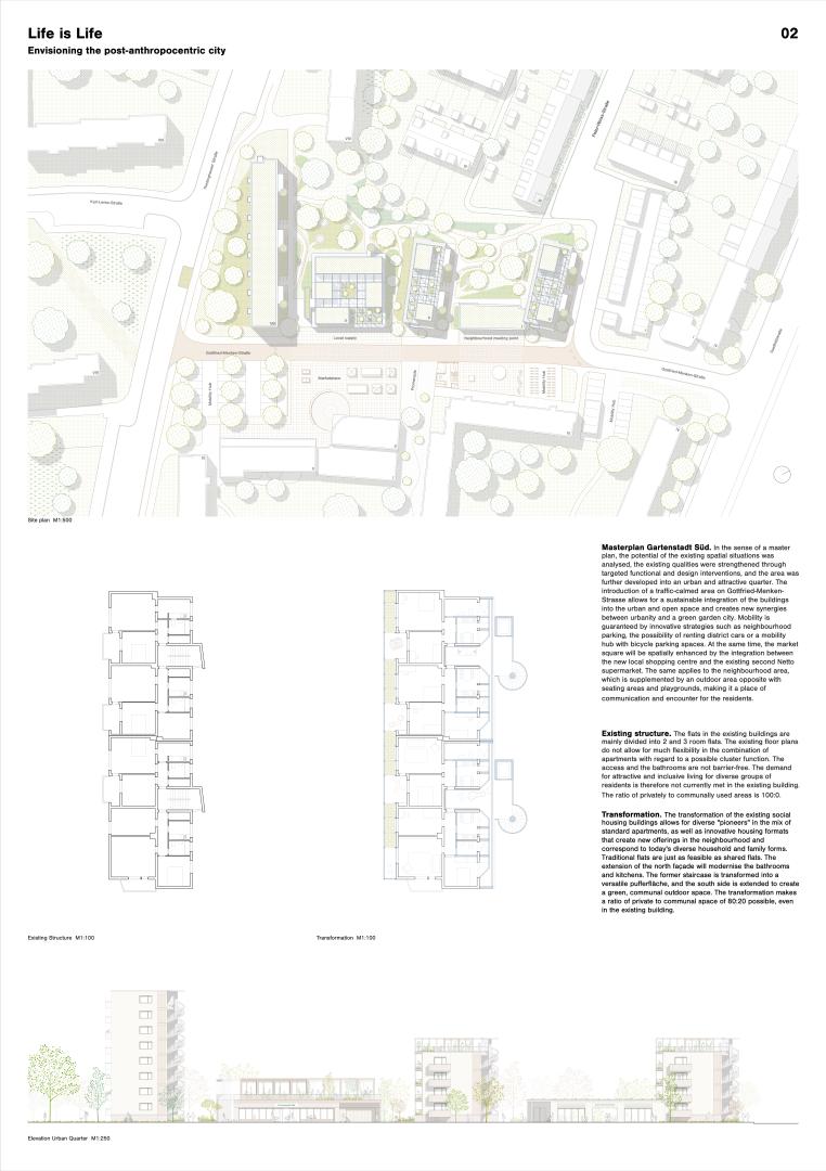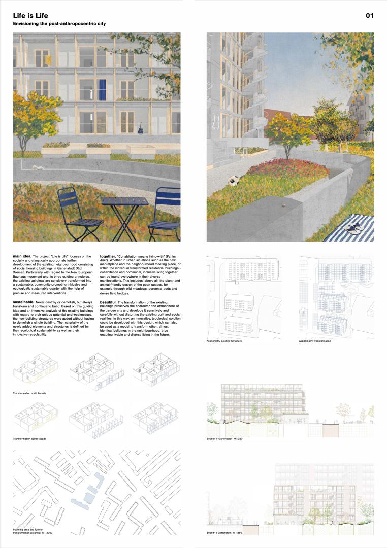 main idea. With the project "Life is Life", I focused on the socially and climatically appropriate further development of the existing neighbourhood consisting of social housing buildings in Gartenstadt Süd, Bremen. Particularly with regard to the New European Bauhaus movement and its three guiding principles, the existing buildings are sensitively transformed into a sustainable, community-promoting and ecologically sustainable quarter with the help of precise and measured interventions.