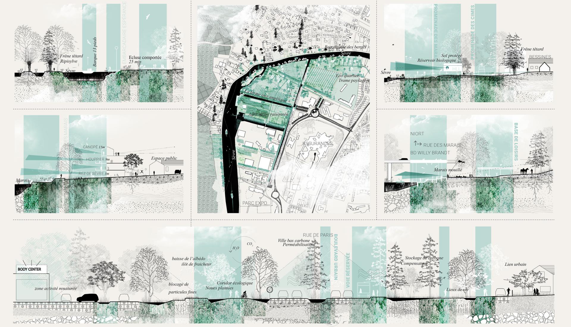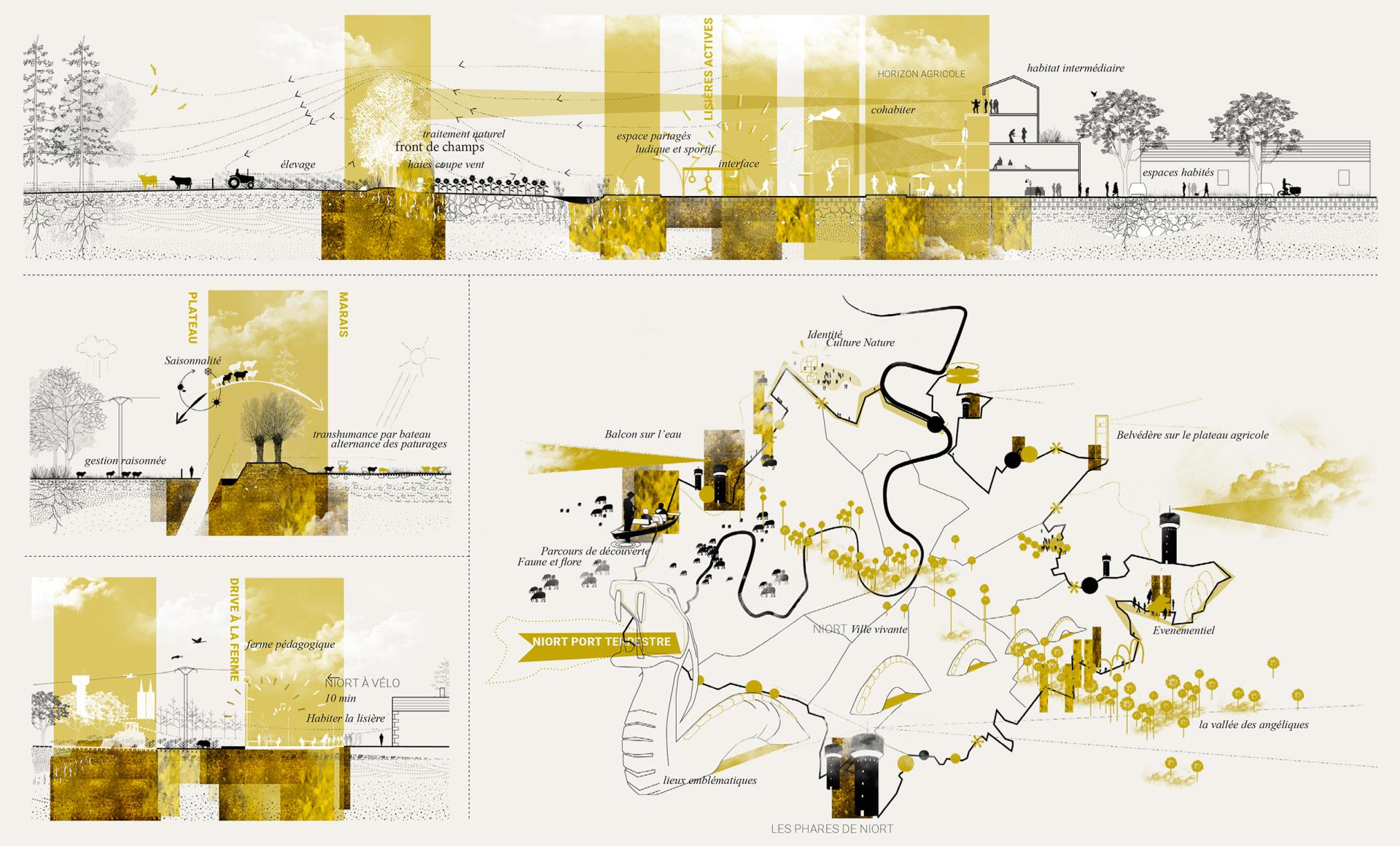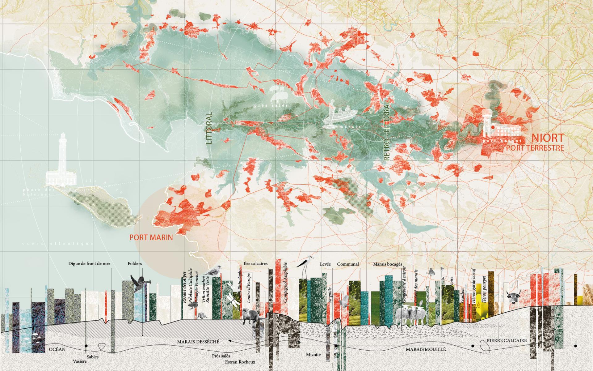 The « Intergovernmental Panel on Climate Change » report from 9th of August 2021 is irrevocable. The human action on economic, urban and productive development has transformed the exchange approach and the environmental control. In such a way that we will be facing frightening and uncontrollable events: rising floodwaters, droughts, heavier rainfalls and less distributed… these results will redistribute the overall, the human living, a wide ranging and invisible concept, however un the center of our current concerns. We are interested particularly in the city of Niort and its relation to the coast and its geography: do we have to battle against the elements by reinforcing the dykes, by increasing protection against the inevitable rising floodwaters? Or should we support the rising floodwaters in its variation? we are sure that the second option is the right one.This thinking is the starting point of our reflection on geography and land. Our approach first focused on the land, the observation and the decoding, the understanding and the survey of the potential assets: a vegetal and cultural heritage, rich and diverse views, invisible property, over calibrated installations, numerous activities, rich grounds, the presence of water, a variety and abundance of landscapes… starting point of a various shades of land.