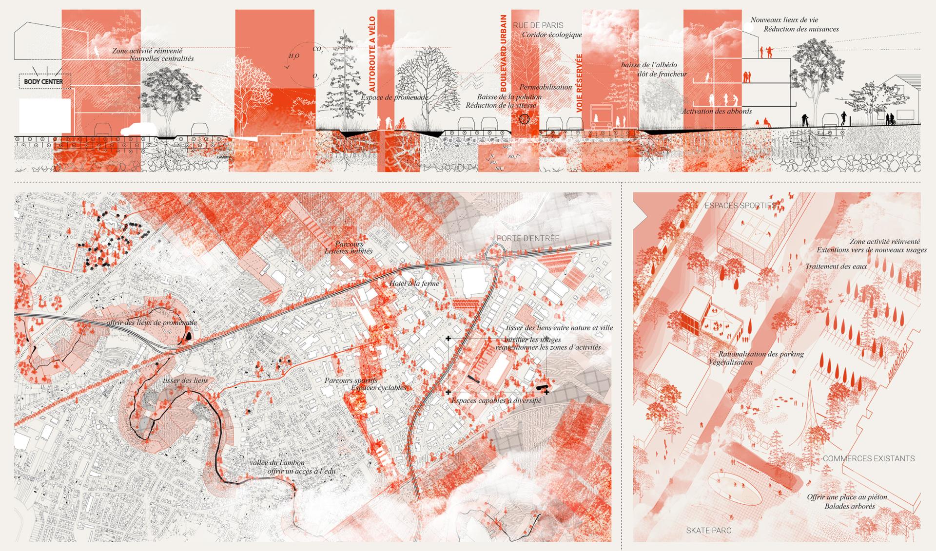We are particularly interested in contact zones to invent a lexicon of living edges: fertile and three-dimensional interfaces between natural and anthropized environments where there is a mutual valuation (circularity) of space, resources and living conditions. lives, for man but also for fauna and flora, always with water as a support for life, uses and the diversification of ecosystems. Our proposal is thought out in cross section in order to highlight the new positive alliances to be implemented between the different natural, agricultural and inhabited environments.