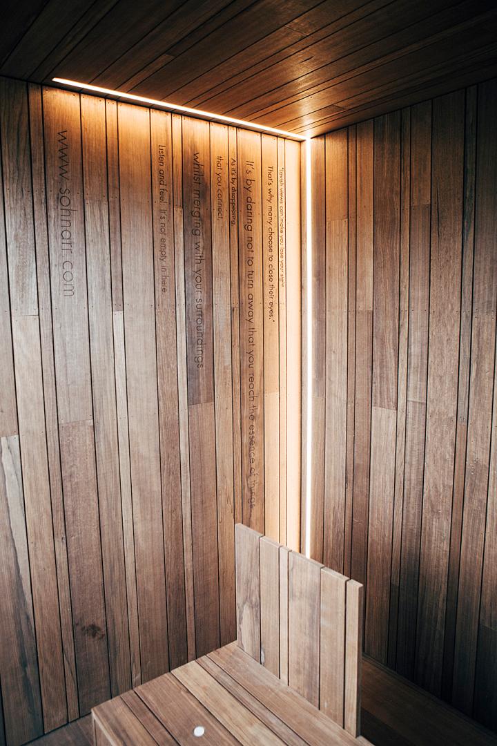 The Sjel measures 3x3x3m in order to create a real sense of safe space while avoiding claustrophobic feelings. In the middle of the Sjel there is a fixed seating furniture with an incorporated display to start the music and regulate the volume. These are the only buttons visitors can see and push. The solar panels are fixed on the roof and not visible to visitors. The Bose soundbar is incorporated in a small wooden tablet in front of you. Underneath the seating there is a hidden Bose bass module. All other technical devices (batteries, electrical components, harddisk,..) have been integrated in the wall behind a hidden door.