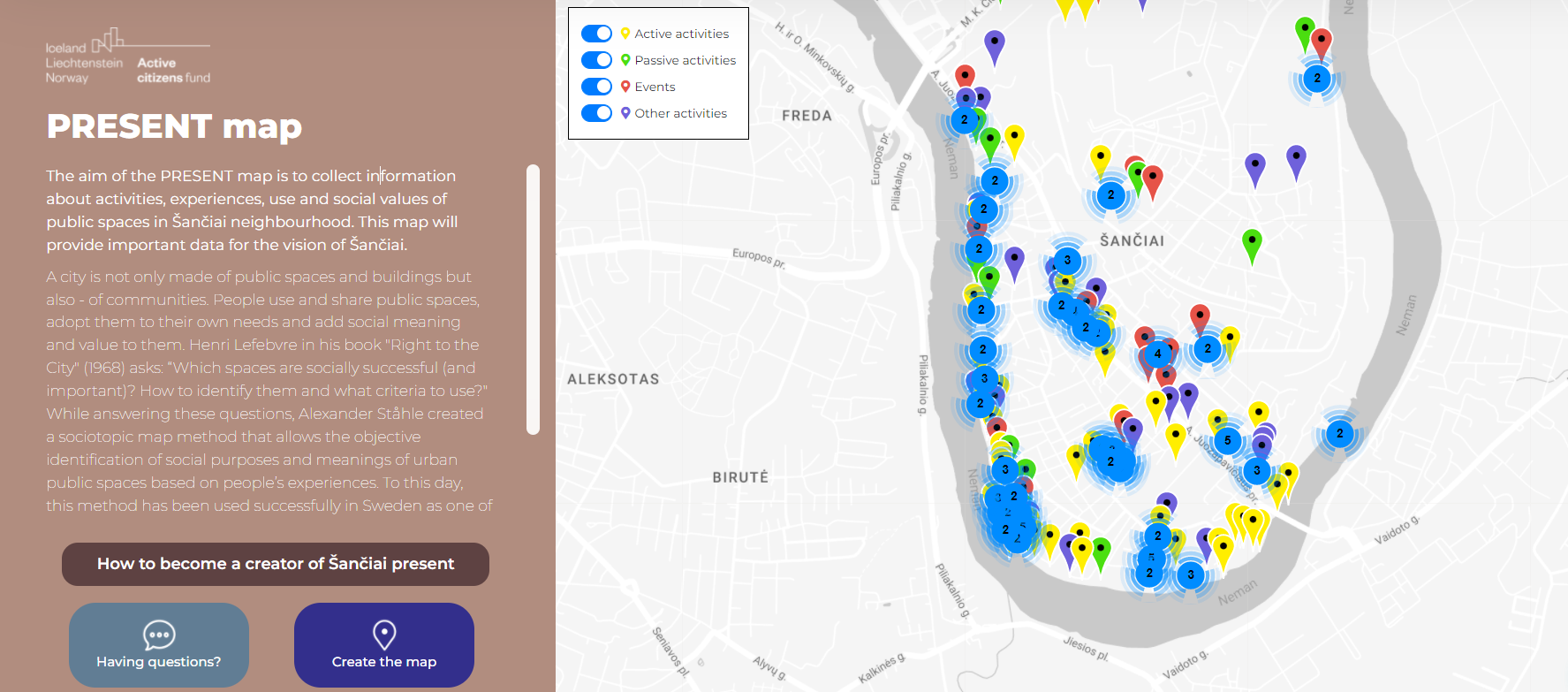 1. Development of an interactive digital Memory Map; Present Map and Nature Map that targeted the community of Sanciai. It include workshops in schools, disability centres, active age groups and live and online community workshops. For instance six creative workshops too place with157 children and 39 adults involving five facilitators. Citizens were empowered to create a digital historical map data base across four epochs and all registered heritage of the area was integrated. The complex data was systematised and is available to the public and linked to geographical coordinates. In relation to the 'Sociotopic' Present Map a comparative process and result was achieved. In this case there were 569 people who participated in live workshops especially in local schools. In relation to the Nature Map another comparative process and result was achieved but was delivered solely online due to COVID 19 restrictions. Each of the interactive maps are located on a newly developed website -sanciubendruomene.lt - which becomes a platform for civic initiatives to do with urban planning and wider community activities. In 2021 it had 4050 visitors who interacted with its various mapping processes.