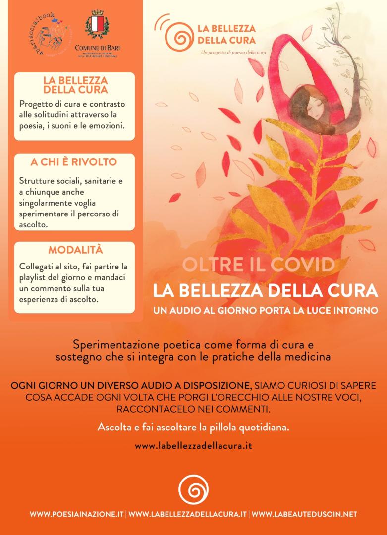 The Beauty of Care, a poem a day lights up your way! Poetic experimentation as a form of care integrated with clinical medical practices, supports and enriches the lives of caregivers and patients. Web-based tool offers custom made audio poetry tracks for relaxation, care, and healing. Every day in Italian and French new tracks that comprise a few minutes of sounds/voices/words built/recorded specifically. The project comprises also training courses designed for medical doctors/caregivers.