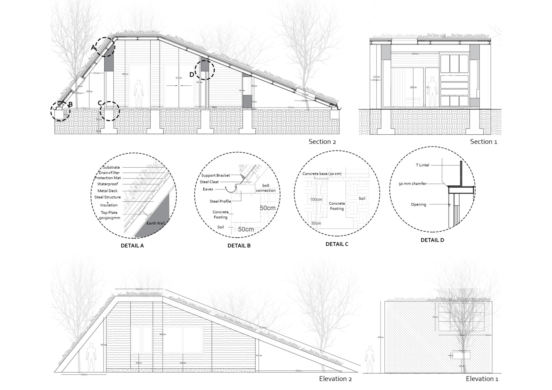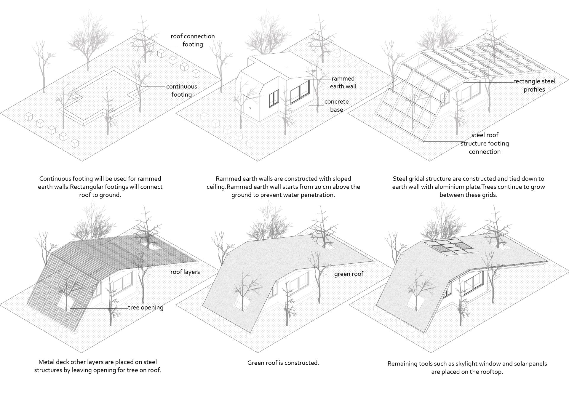 Activity Earth House is a permanent house that will be used temporarily. The design aims to avoid the non-functionality of the house when it is not used by landlords. Since it is a temporary stay place, the house is concealed within nature through a shelter roof. The sustainability of the house is another essential point in this project. The useable area is around 25 m2. Thus,project aims to reduce carbon footprint by occupying less territory area.The form of shelter roof, which is inspired by houses in terrain and vernacular architecture, is created to host various activities during different seasons of the year. People could sled, climb up or walk on the roof. The walkable roof slope is 26 degrees, whereas the climbable slope is 50 degrees. The living space of the house is a combination of modular systems. This system brings functionality for small spaces, and it is aimed to use small areas for different requirements at different times. There is a direct relationship between the height of the ceiling and privacy. While private areas have a low ceiling height, common areas benefit from the highest ceiling, which emphasizes the own properties of spaces and creates the virtual border between spaces. The use of spaces could be modified with elements such as doors and curtains