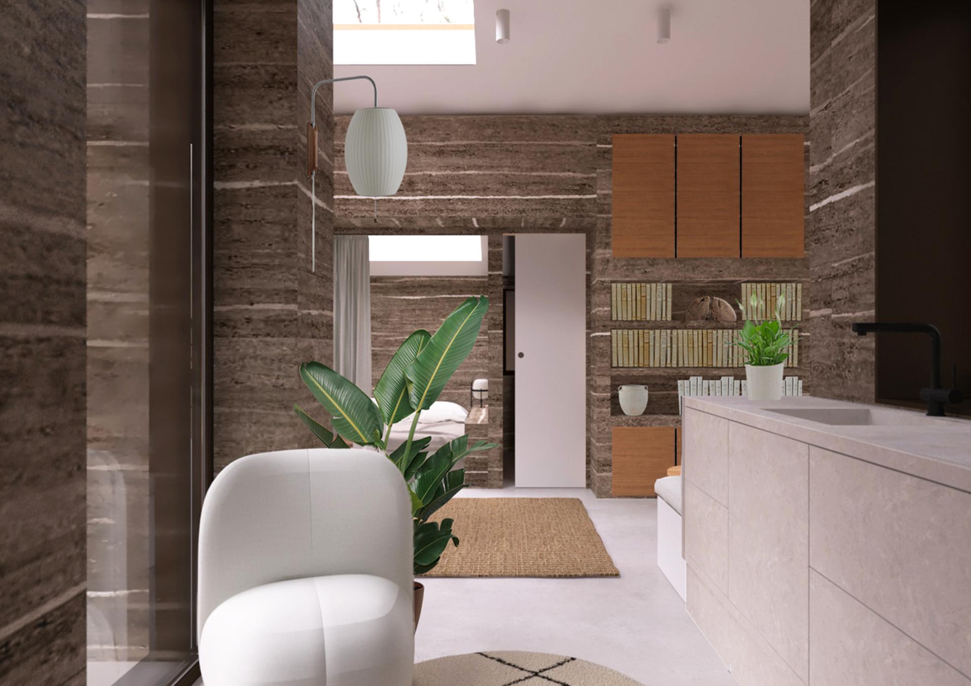 Rammed earth walls have different color and texture variations. Its organic texture and structure create a natural atmosphere in interior spaces for users while the house is a part of the natural environment in the forest. A combination of light-colored materials such as white paint and organic materials such as light wood, and earth provide a convenient atmosphere because interior space becomes brighter and more natural. On the other hand, the vegetated green roof increases reconnection with nature visually and physically. The form of the house was revealed as a result of the distortion of the simple house roof. The simple form of Activity Earth House maintains and bolsters up the composition of the manmade-nature relationship. Besides functional use of roof, it is designed to emphasize “shelter” in nature. The shelter roof demonstrates the feeling of safety by covering the whole house. The form of the roof demonstrates the private-common area relationship by creating different heights. Common areas such as the living room and dining room have a higher ceiling, while private areas such as bedrooms and bathrooms have lower ceiling height. The roof becomes a virtual border element between intimacy and publicness. For the convenient atmosphere of interior spaces, light is a crucial element. Through the location of the house, interior spaces are fulfilled with sunlight. Especially in cold climates, sunlight is an important element for the well-being of people because the day is shorter than in southern countries. In this project, users will be able to wake up through the morning sun. Therefore, the location of bedrooms is planned according to this purpose. Sunlight coming from different angles throughout the day will improve the quality of time experienced.