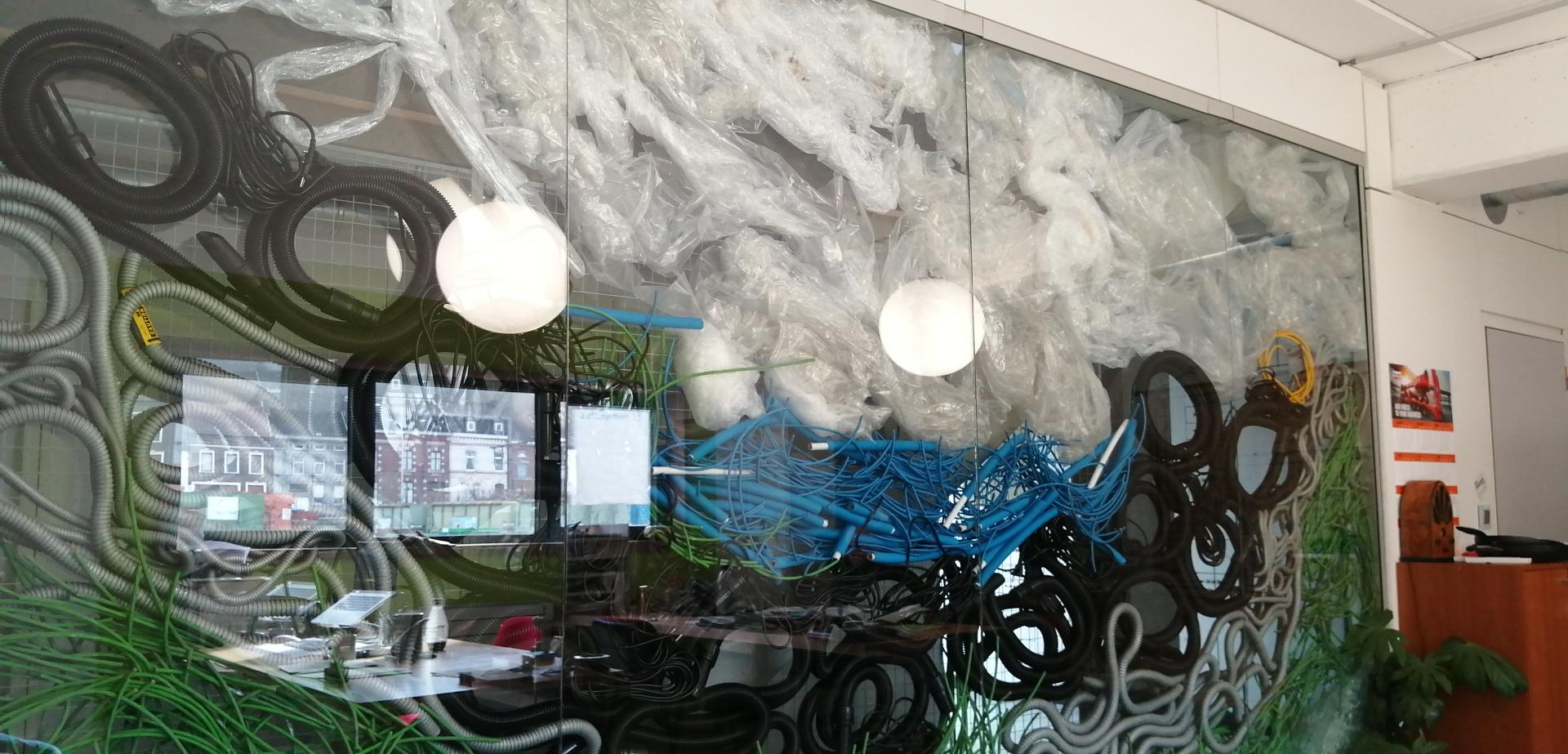 We worked as a team with our own workers to build some of it, which generated interesting discussing and ideas about both the efficient aspect of the office (space, size of furnitures, etc.) and as well in terms of design. We really wanted to maximize the level of reuse, the challenge was to come up with creative ideas so items which would usually have ended in the trash can could actually become an aesthetic tool bringing a unique design to our working environment. One nice exemple is the reuse of cables, plastic bags, and vaccum cleaners tube as decoration. These alwyas amaze our visitors. Same for our cooper tube that we used as support for shower curtain.