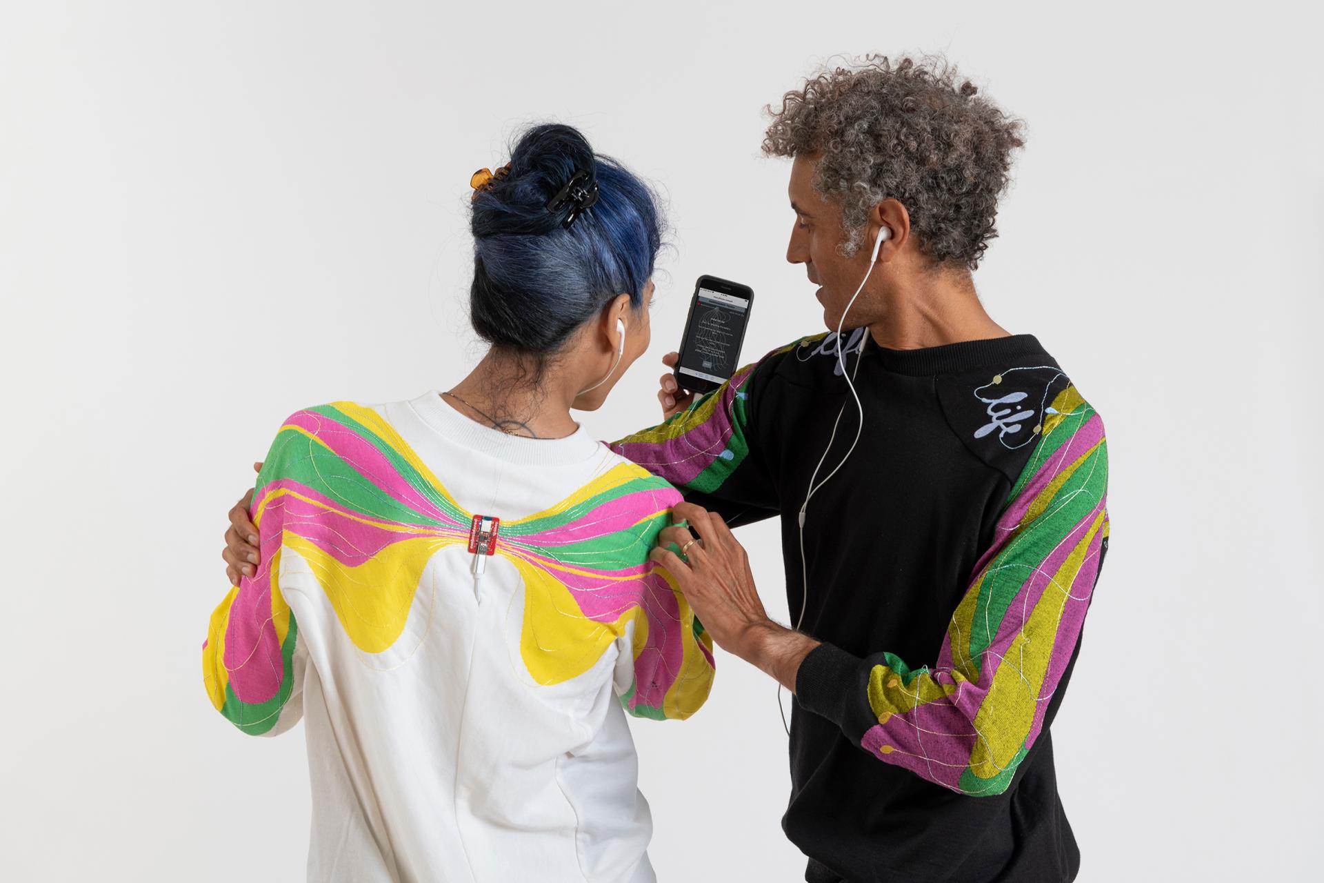 on an external device (laptop, speaker, or mobile phone). The signals trigger a sound file to play through the device, which is a mix of field recordings from nature, urban spaces, string, and percussion instruments created by musician Peter Maunu, as well as spoken and sung words by Christine Shallenberg. The result of this collaboration is four embroidered touch-sensitive sweaters (two for adults and two for children), which communicate through sound and color changes as a response to touch and body heat.