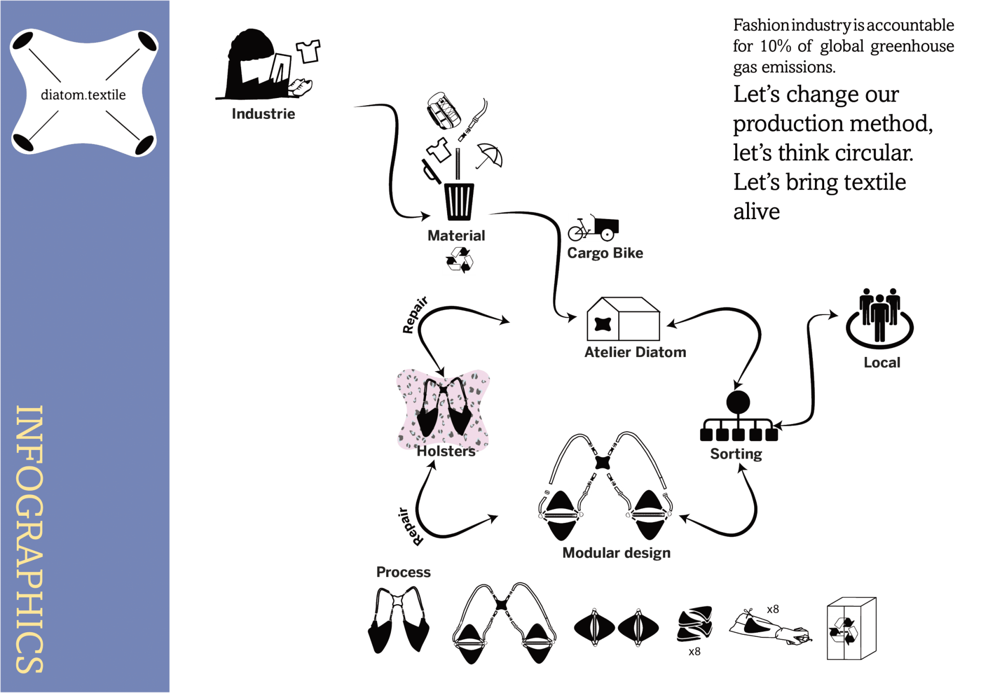 Overall, diatom implies a complete new method of urban production, making the best use of what is already existing (and despised), in order to turn it into a practical, aesthetical, fashionable, completely traceable and gender neutral product to carry your belongings in any type of environment.