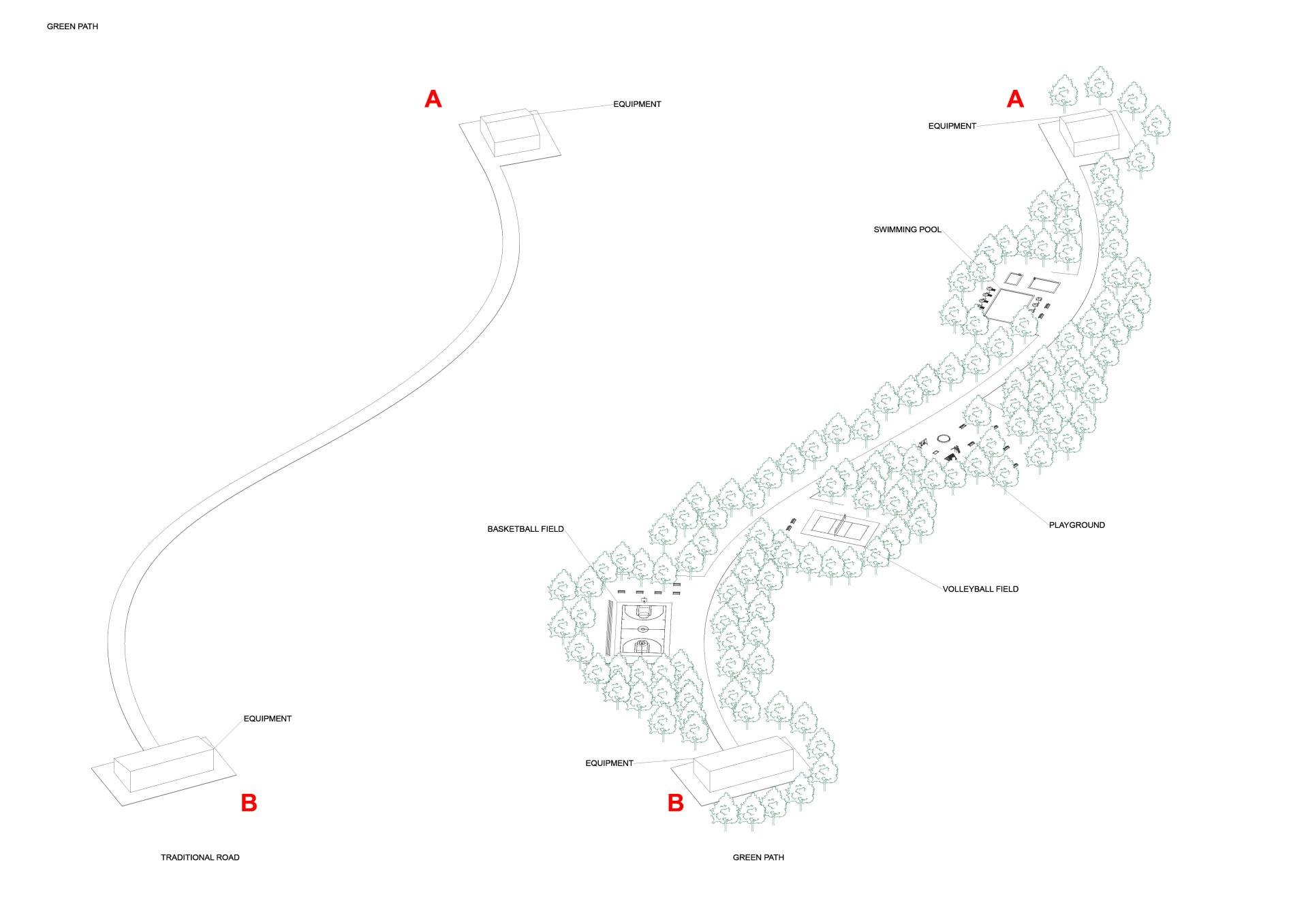 The second action envisaged in terms of environmental sustainability is the rethinking of mobility in rural areas. The biggest problem of inland areas is determined by the absence of services and the difficulty of reaching them quickly. The rethinking of mobility passes from a new structuring of the equipment into a widespread system connected through three levels of roads. These must not only be thought of as connecting units, but as linear forested infrastructures and become places capable of hosting public and leisure activities. The green paths with slow or pedestrian electric mobility connect equipment sized to the scale of rural nuclei, then reconnecting to the natural system of regional parks; green roads with medium electric mobility connect the equipment sized on a group of villages; green highways connect the group to large cities.