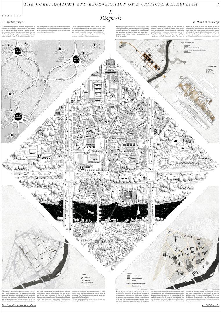 Our concept corresponds to the formulation of a guide plan for the Saint-Martial district in Limoges. Following the concept of “Living city”, we proposed a conceptual approach of the city of Limoges as a metabolic urban organism. As a three-headed living organism, the Limoges metropolitan area is affected by a disconnection of its main components – the ville-centre, the ville-route and the ville-campagne. The project site benefits from an ideal situation and consitutes a unique opportunity to open the city centre, reconnect these components and implement new synergies between the stakeholders and the inhabitants of both the neighborhood and the larger city. In this vision, the project site constitutes a urban synapse. As long as this urban synapse remains inoperative, the nervous influx of the metropolitan organism cannot flow.