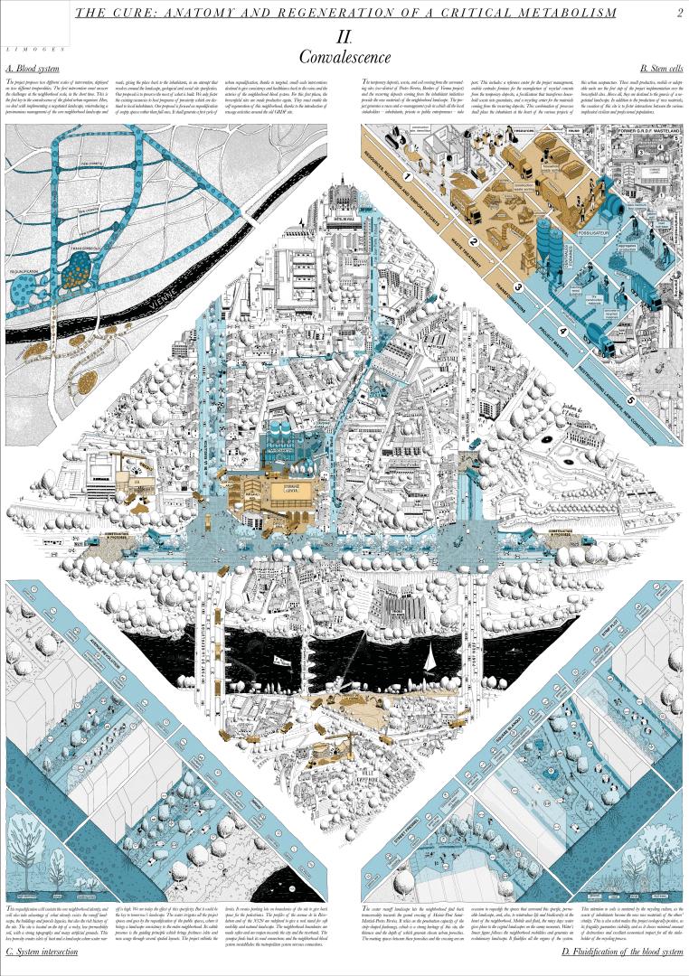 For The Cure, Limoges is a living city which is experiencing disease. The cure must be designed for the long-time effect. It has to be realistic in terms of resources and processes, and positioned to serve the environment, the landscape, and the inhabitant. The shared new programs like the local refurbishments and the negotiated landscape and its recycling assets and its water and natural space management also participate to requalify the site, which finally creates a unique biotope that can’t be found elsewhere. Thus, we propose to reveal local territory assets across common shared values. The issues at stakes are economical, but also deal with production and culture.