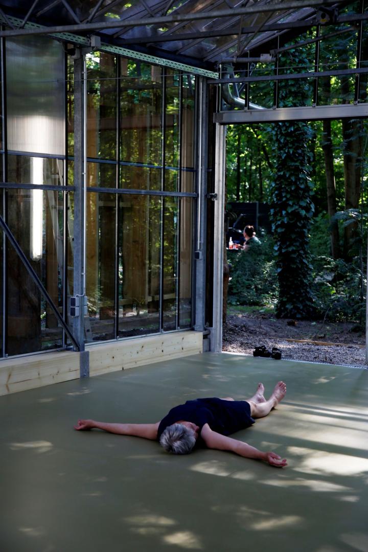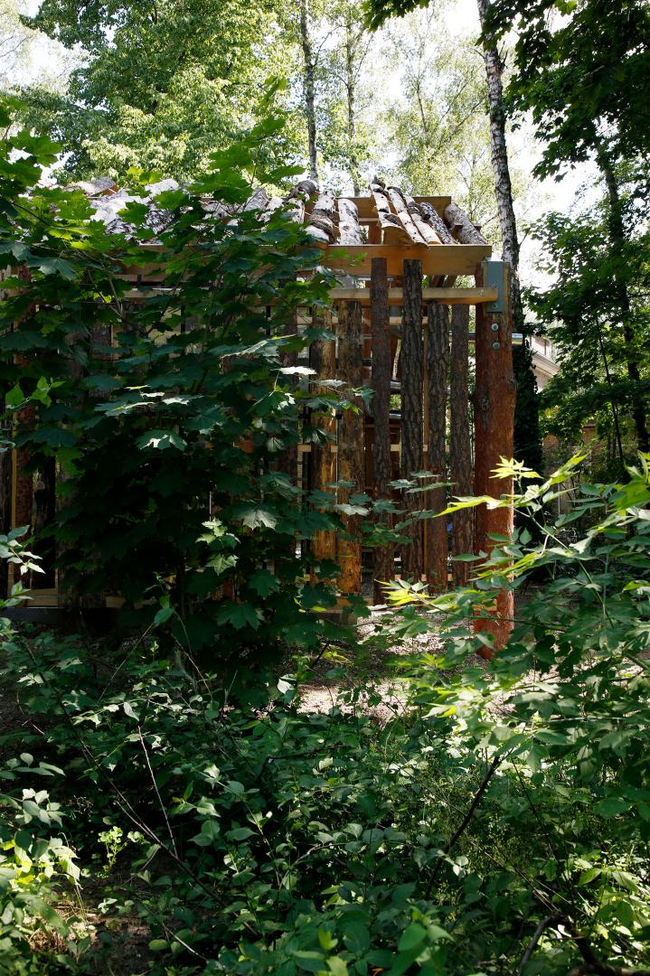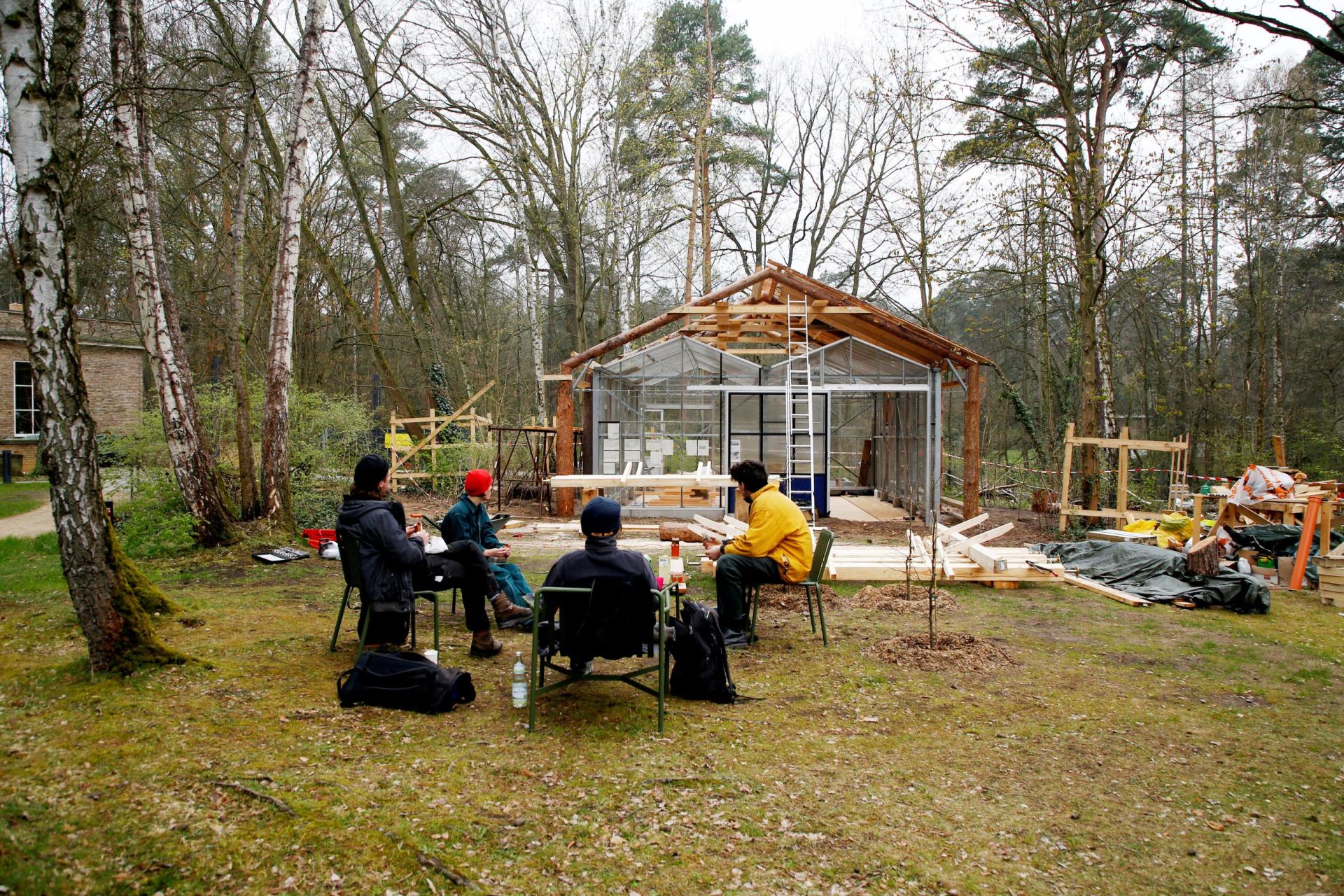 The construction is a hybrid: a raw wooden shell made of whole tree trunks envelops a recycled industrial greenhouse. The trunks consist of segments of five pine trees from the museum's garden that had to be felled in the winter of 2021 (due to infection which made them unsuitable for the wood market). In a first step, the whole tree trunks were moved across the garden and erected in cooperation with the “Forstgruppe” (forest group) of the “LebensWerkGemeinschaft” (an association that runs workshops for people with disabilities). The next step was the construction of the roof framework, into which a disused Venlo greenhouse was assembled by the horticultural company Exner Grüne Innovationen using old metal structures and new glazing. The outer shell of the greenhouse was built from trunks, logs, planks, slats and rinds (these are the leftover edges of tree trunks that are produced when the latter are processed into wooden profiles; here from Grunewald, Potsdam and Königswusterhausen in Berlin’s periphery). This involved a hyper-local approach that aimed to use materials from the surrounding forest – the environment transforming itself into a space through the most-minimal modifications possible. The greenhouse is made of recycled steel profiles, glass surfaces and web triple panels and was industrially prefabricated. It utilizes a Dutch plug-in system (venlo) that is already reused and can be flexibly built into a greenhouse of any size in the future. The conscious use of resources and minimal production of waste after the end of the building’s useful life were the priority, because the status quo is appalling as we know, with roughly 40 % of energy and resource consumption and one third of net waste in Europe generated by the construction sector annually.