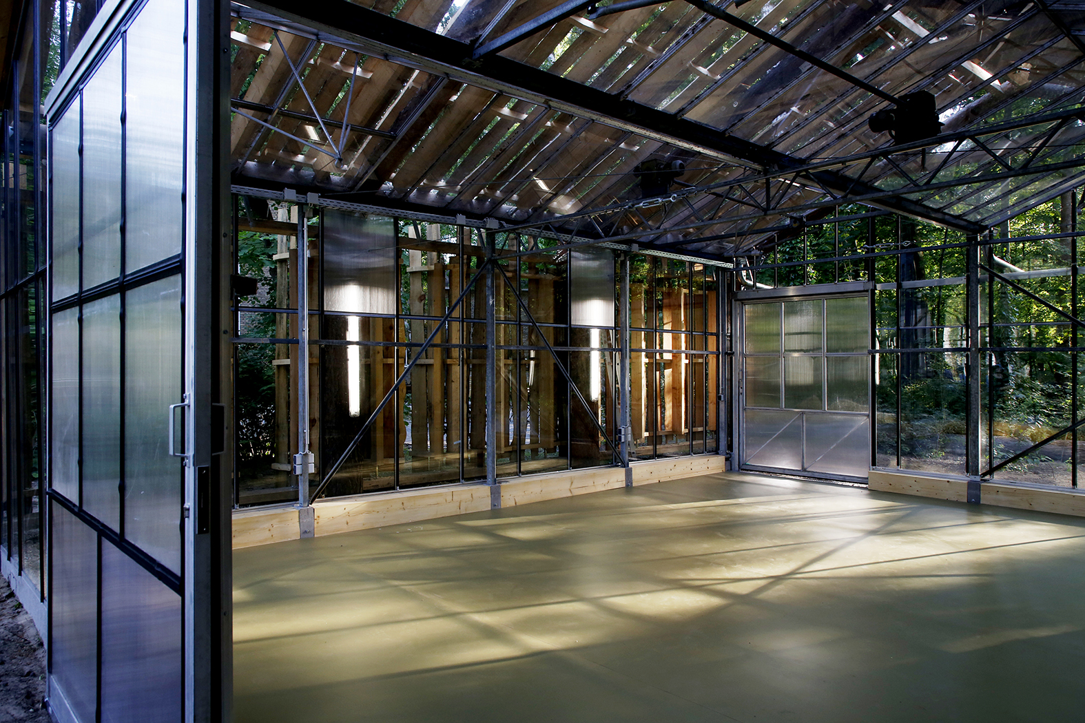 The new building offers the Brücke Museum an additional space for working with different publics and neighbourhoods. Placed in the museum's garden as it borders with the edge of the forest, the Waldraum – in its materiality and grey energy – sits in dialogue with the seasons and the surrounding trees, positioning the visitor as a guest of the museum's surrounds. For the realization of this hybrid building, which consists of a rough, raw wooden shell and a glass industrial greenhouse, the architects focused on situational thinking and a locally-oriented mode of working: the wood is sourced partly from the garden of the Brücke Museum itself and the surrounding forests, while the greenhouse is a recycled industrial product. The slat-like wooden outer shell can be adjusted depending on the light situation, providing as much shade as possible during warmer seasons and letting in as much light as possible when temperatures are lower. Sustainability and resource conservation determined the entire design process and implementation. The use of wooden materials for the outer shell means that the space blends into the natural environment. The greenhouse itself, however, forms an energetically and technically efficient cultural space in contrast to its environment.