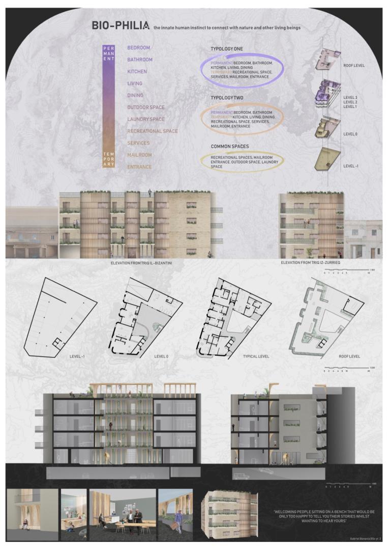 Throughout this proposal, with innovation, sustainability, and tradition in mind, a co-living residential project was conceptualized. Bio-philia is a residential proposal highlighting an intergenerational way of life. Thinking in terms of temporary and permanent spaces, this project aims at re-immagining private and shared spaces for our elderly population, wrapped within an envelope of several traditional techniques married with innovative and sustainable timber technology.