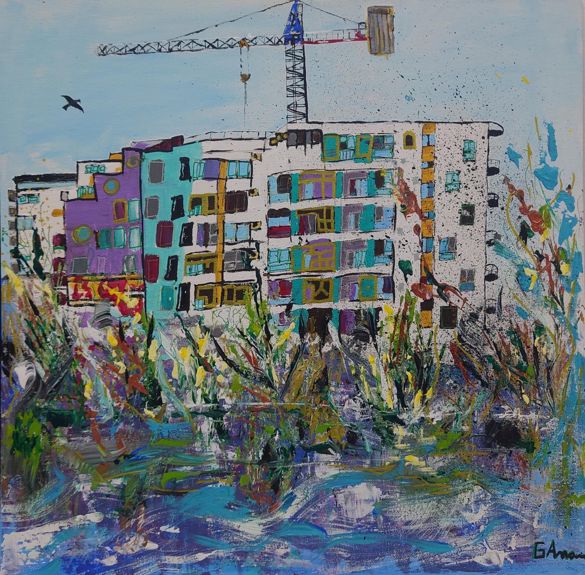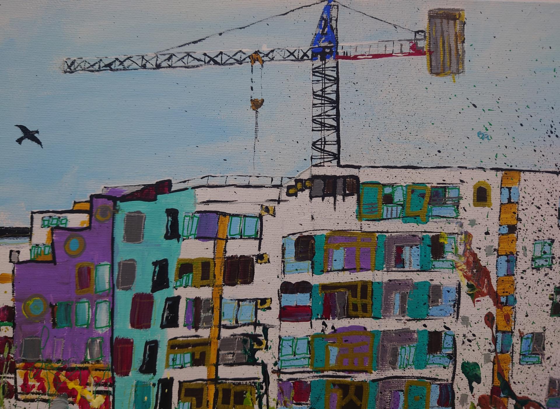 Painting is the embodiment of aesthetics, expressing through colors the emotions, feelings and alarm signals drawn by the artist regarding a cause. In my work, the crane as a machine embodies the intrusion of man into the heart of nature. The splashes of color on the right symbolize the cry of pain of nature. The lake mirrors the newly built block, and the plants at its edge have the impression that it climbs the construction, thereby wanting to show how close it is being built.
