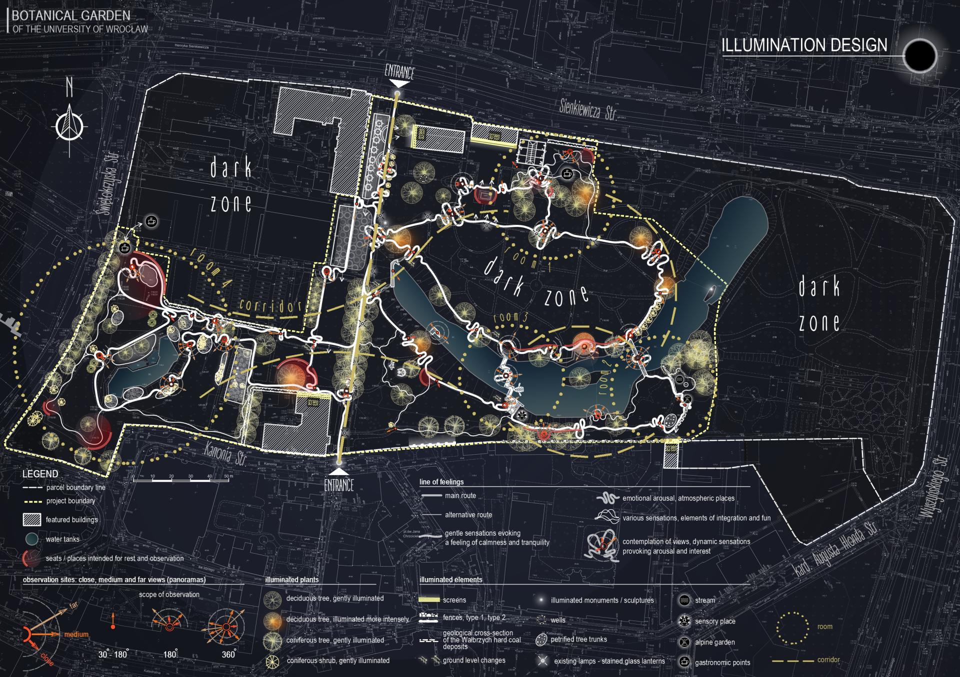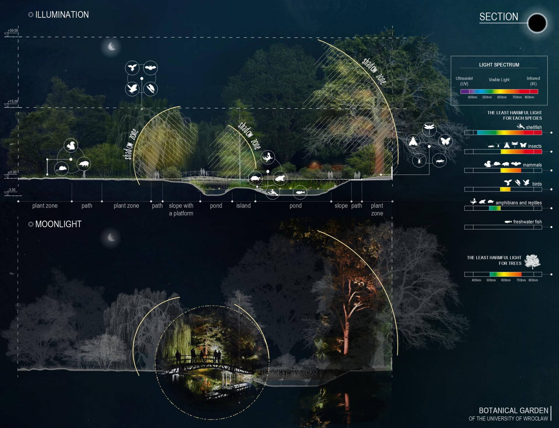 The goal of the project is to redefine the concept of darkness and to demonstrate, based on the example of the Botanical Garden of the University of Wrocław, that the expansion of over-lighting remains an anachronistic approach. The designed illumination of the Garden proves that it is time to break the paradigms of using lighting and the proper moment has come to implement the policy of minimum levels of light intensity - especially in the areas intended for pedestrians. Our project illustrates that adopting the right amount and the proper spectrum of light for the benefit of urban ecosystems constitutes a powerful tool supporting the Sustainable Development Goals, which include the following issues: